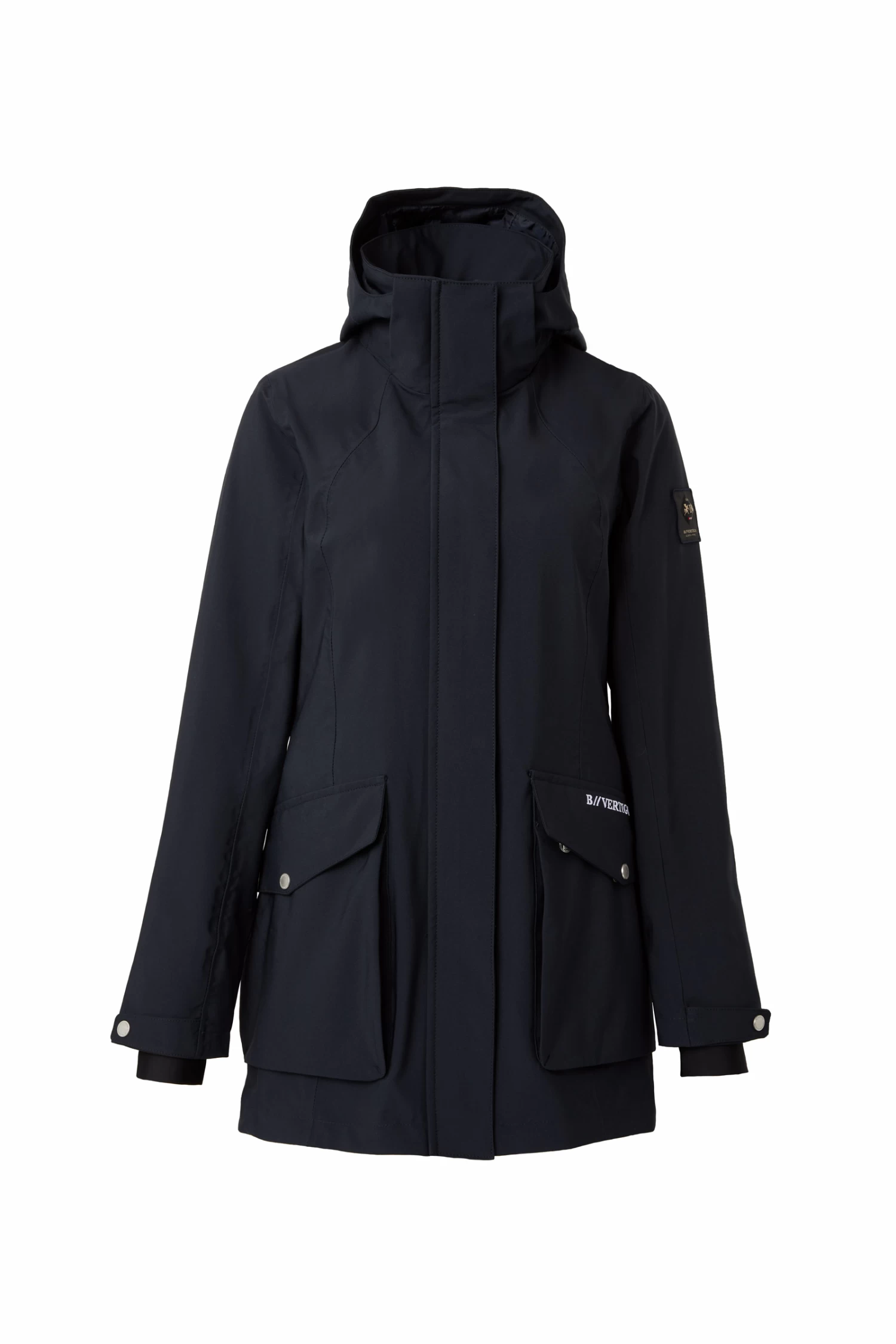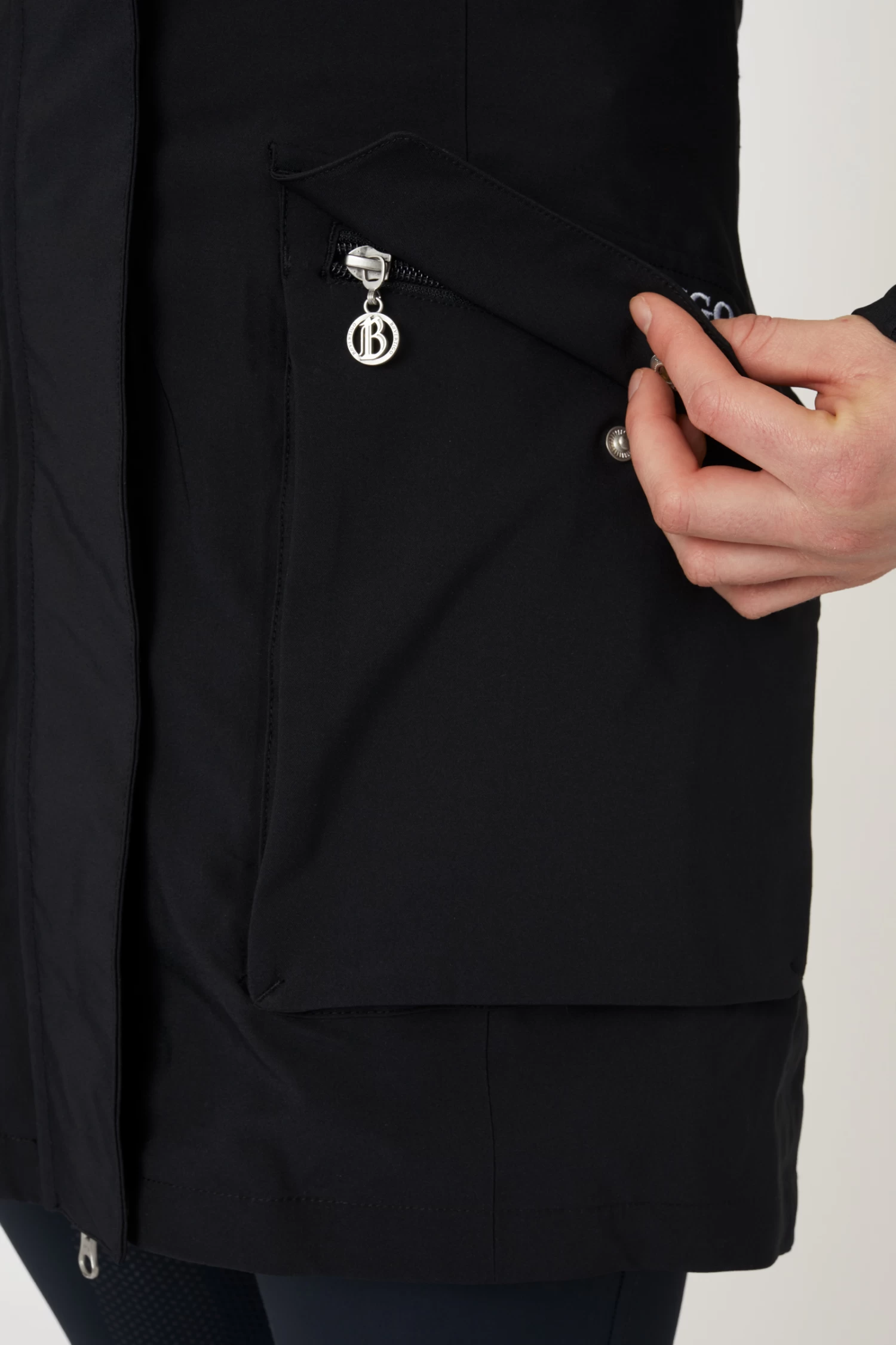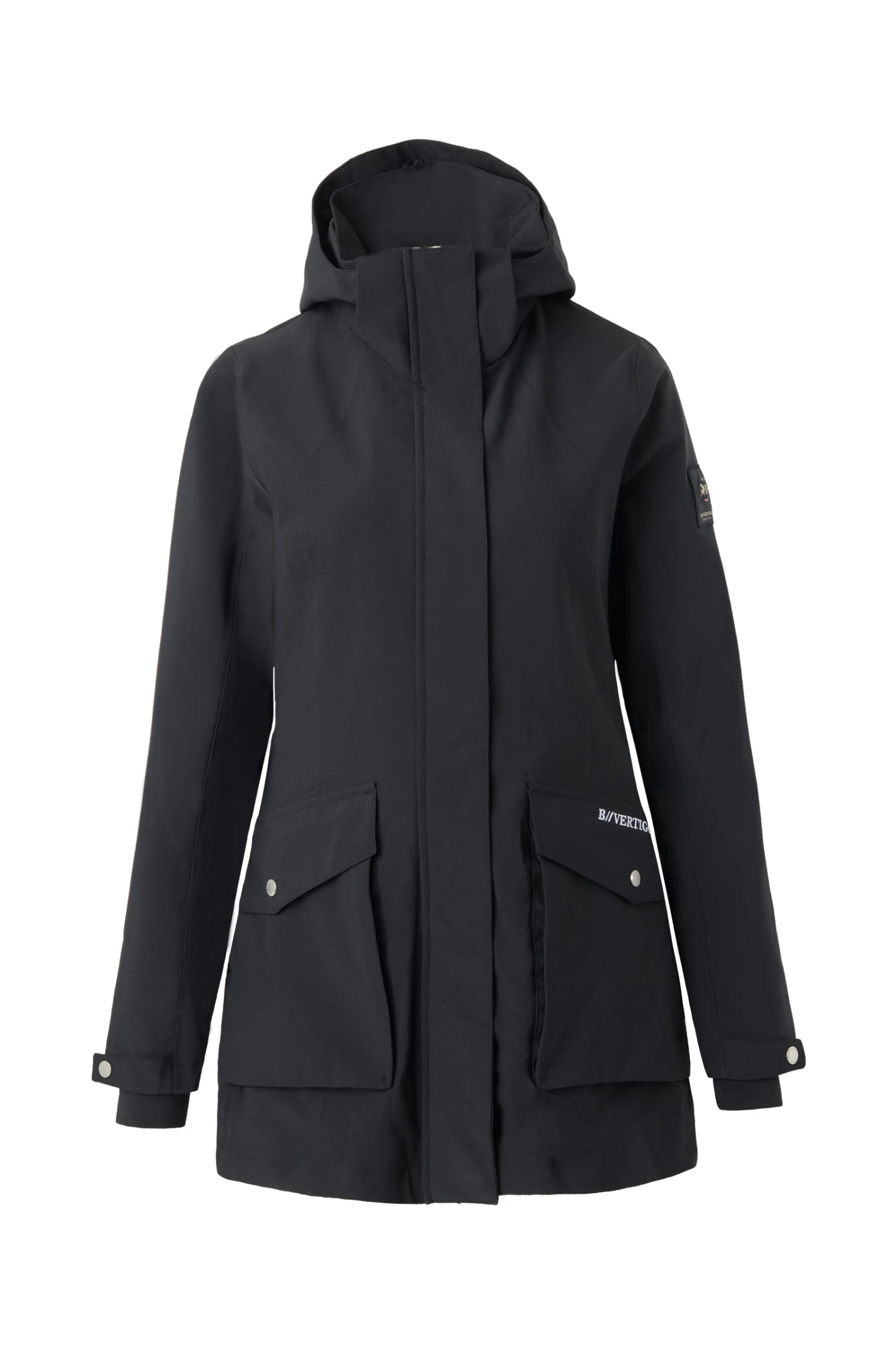The B Vertigo Caroline waterproof jacket perfectly protects you from rain and wind. The long cut adds warmth without restricting your movement or damaging the saddle due to two back slits with magnetic buttons that open up widely. Big pockets with zippers and press buttons keep your belongings safe. The hood can be easily detached with a zipper. Elastic cuffs inside the sleeves are extra comfortable and waterproof. Elastic draw string at the waist adds a flattering shape. Pair it with our B Vertigo Caroline fleece vest for extra warmth.