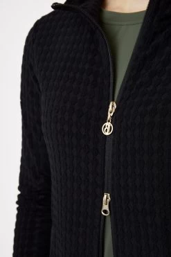 Soft fleece jacket with generous mesh insers at the sides and under the sleeves for increased breathability. Hidden zipper pockets at the front. Delicate pale gold details like front two-way zipper and logo print at lower hem and below back neck. The bubbly fleece fabric creates a stir not only at the stables.