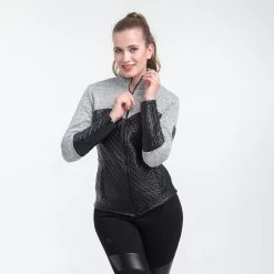 Elegant, knitted sleeve field jacket with waterproof inserts. Sporty style with feminine lines gives this jacket the perfect look for everyday training, wearing around the stable or around town in any climate. The contrasting panels and different fabrics add a touch of special detail. The jacket is designed to move gently while you ride, while the zippered pockets will keep your belongings safe. A two way zipper in the front of the coat can be opened from the bottom to allow the rider to sit comfortably in the saddle.