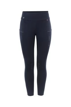 Comfortable riding leggings with small, lovingly designed details. The bi-elastic functional material is lightly brushed on the inside and ensures a pleasant wearing comfort. Mobile phone pocktes on both thighs with reflective edging tape. Exclusive Ingrid Klimke label with four discreet rhinestones on the right thigh. A Klimke artwork decorates the mobile phone pocket on the left side. Zip pocket on the back waistband, also decorated with silver Ingrid Klimke artwork.