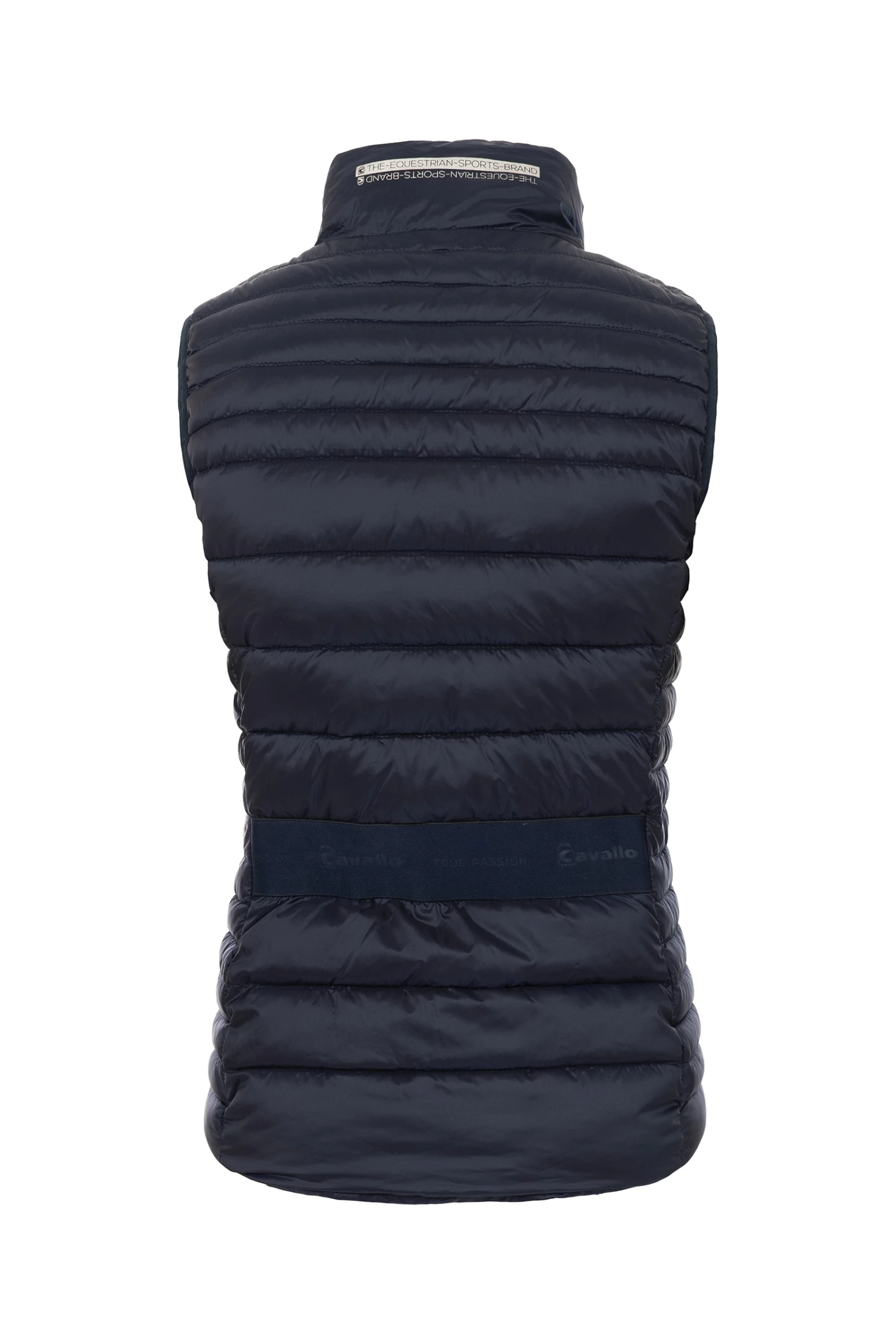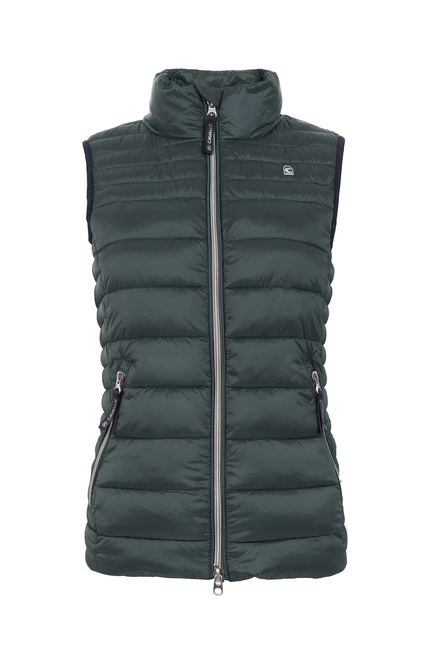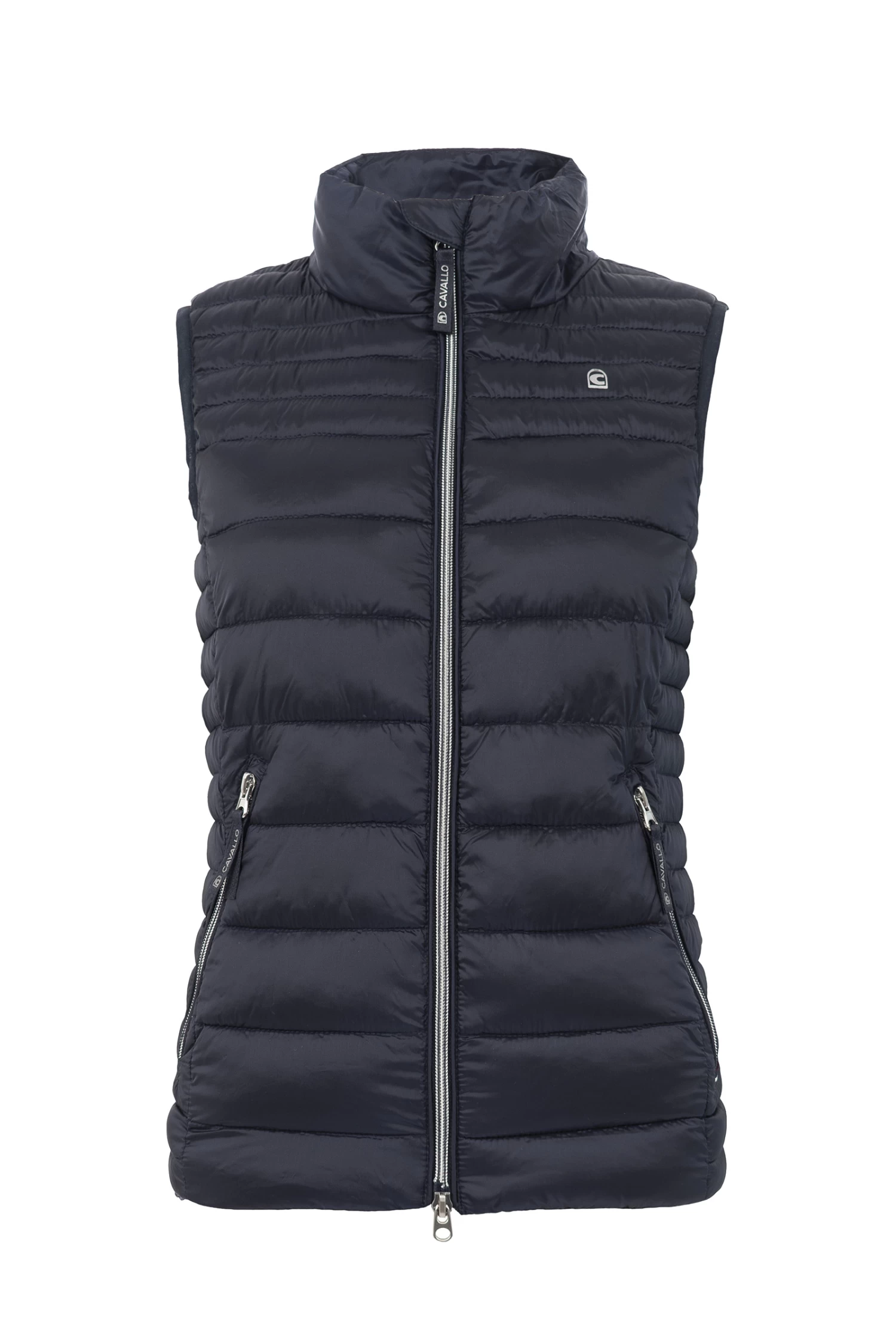 With stand-up collar and slight waistline. 2-way front zip with Cavallo woven ribbon pull. Two front pockets with zips. Inside pocket with zip. Silver prints, e.g. Cavallo logo on the left breast and Cavallo artwork at the back centre of the collar. Tonal Cavallo artwork on the zip underlay in the front centre. Dark blue lining with discreet all-over stirrup print. Decorative Cavallo elastic band insert at the waist in the back. Narrower quilting on the side panel and shoulders.