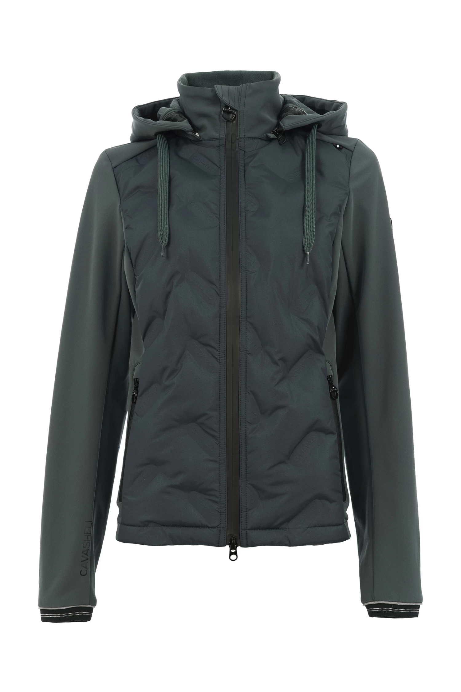 With light fake down filling and detachable hood. Quilting, welded with modern hollow effect, with integrated Cavallo lettering. Two spacious front pockets with rubberised Cavallo printed zips. 2-way front zip, rubberised and with Cavallo print. Zips with Cavallo jewelry pull with crystal. All accessories are black. Cavallo artwork on the outside of the hood. Cavallo woven ribbon on hood inside running in black. Narrow elastic band with reflective piping at the cuffs.