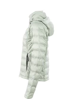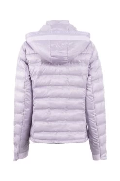 Filled with fake down jacket with modern hollow effect in the centre front and back as well as on the upper arm. Detachable hood can be fixed at the back. Hood and sleeves are decorated with a tonal logo band. Hood with drawstring. Sleeve hem extends to cover back of hand 2-way zip in the front as well as two slit pockets with zip and blue Cavallo woven ribbon pendant. Silver artwork on the chest.