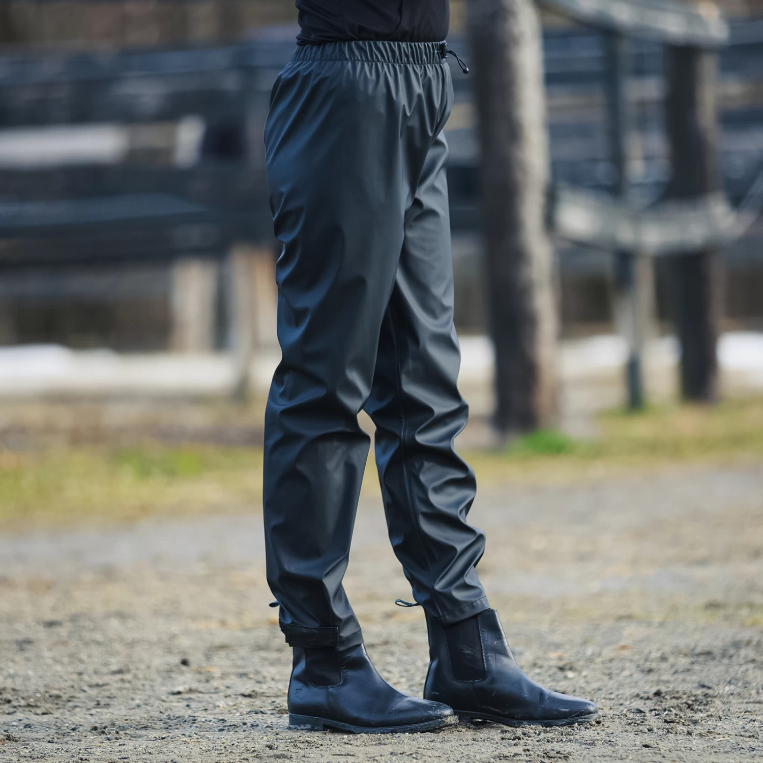 These pull-on Horze Billie Women’s PU Rain Pants are created from flexible, stretch PU fabric. Waterproof seams keep moisture out while you go about your stable chores or ride. The reflective print logo adds a glimpse of visibility.