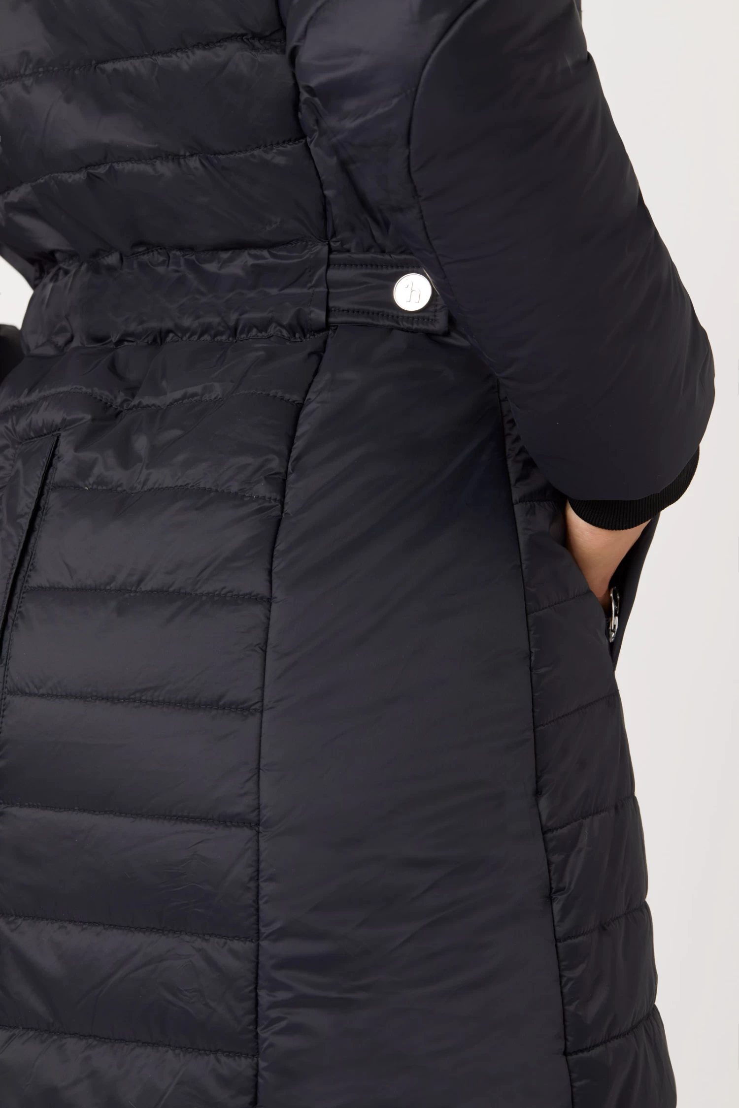- Opening skirt at back hem with magnetic snap closure Elastic straps inside the coat to keep hem in place