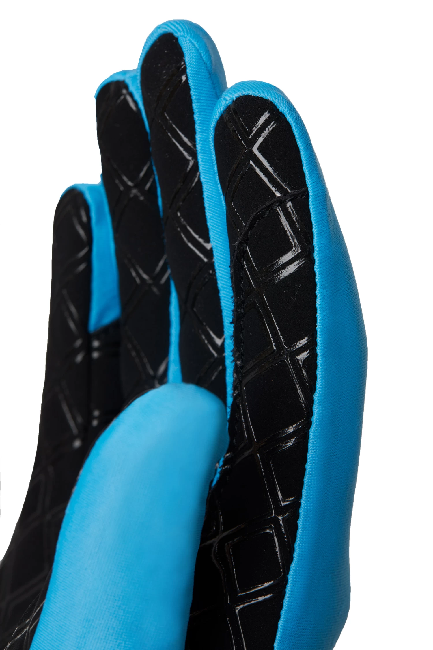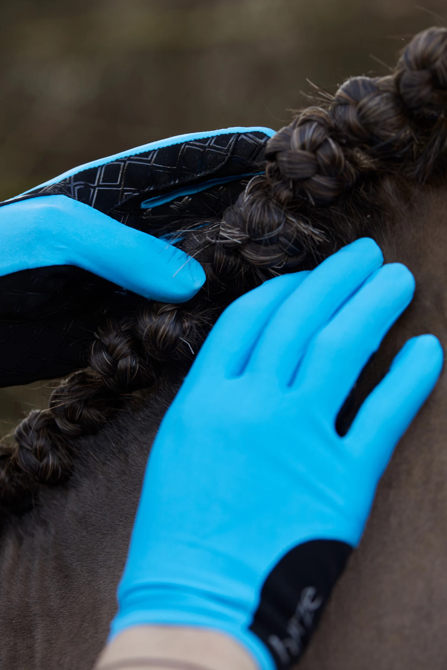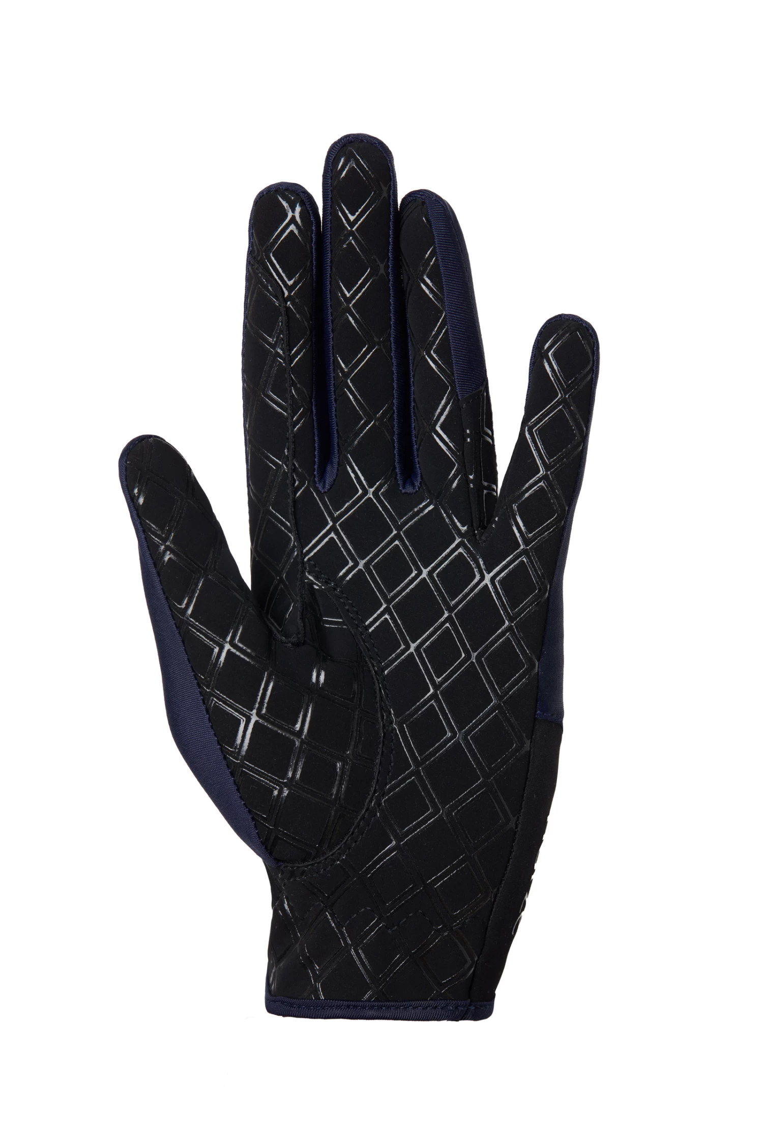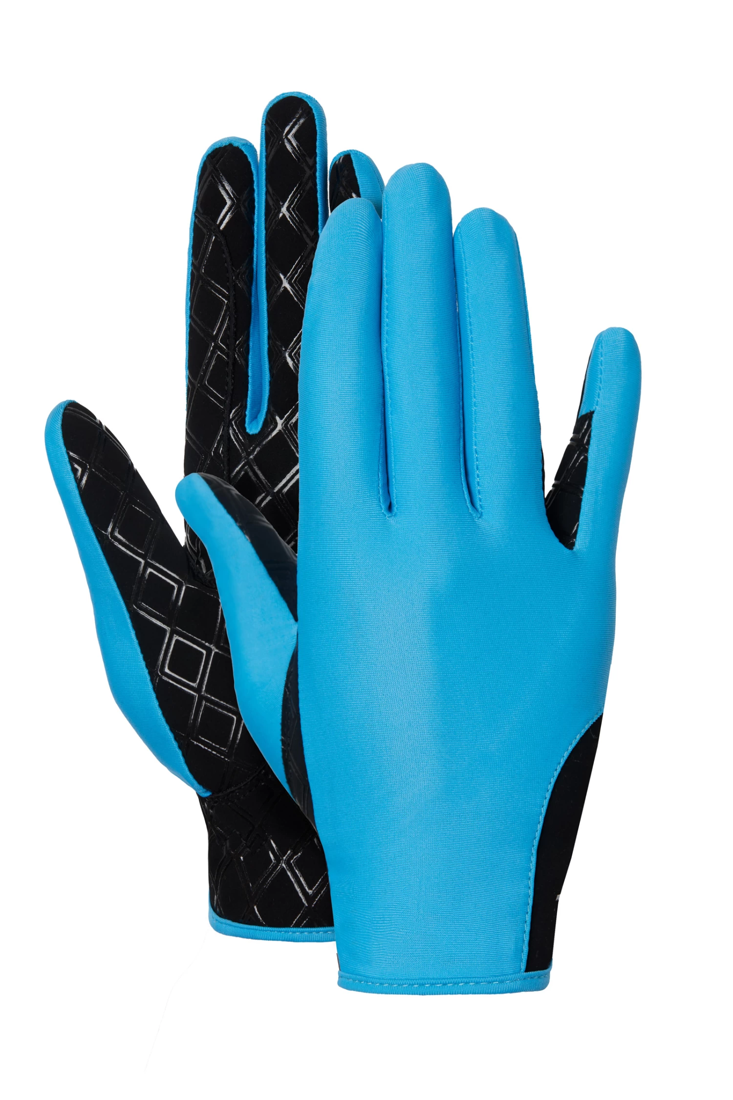 The Horze Eliana riding gloves are made from stretchy material, and equipped with grippy silicone on the PU leather palm. The elastic cuff holds them in place.