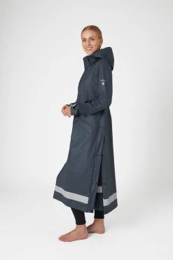 This long raincoat makes it fun to ride in the rain. It has slits at the sides that close with pressbuttons. This makes it easy to widely open the coat over your thighs and saddle to keep them dry in the rain. Leg straps inside keep the waterproof hem in place when you are riding. The hood protects your head and can be removed when the rain stops. The adjustable cuffs and elastic in the back ensure the perfect fit and flexibility with this raincoat. Reflective stripes at the hood and bottom hem make sure you are visible in gloomy weather. Big pockets keep your belongings safe and dry.