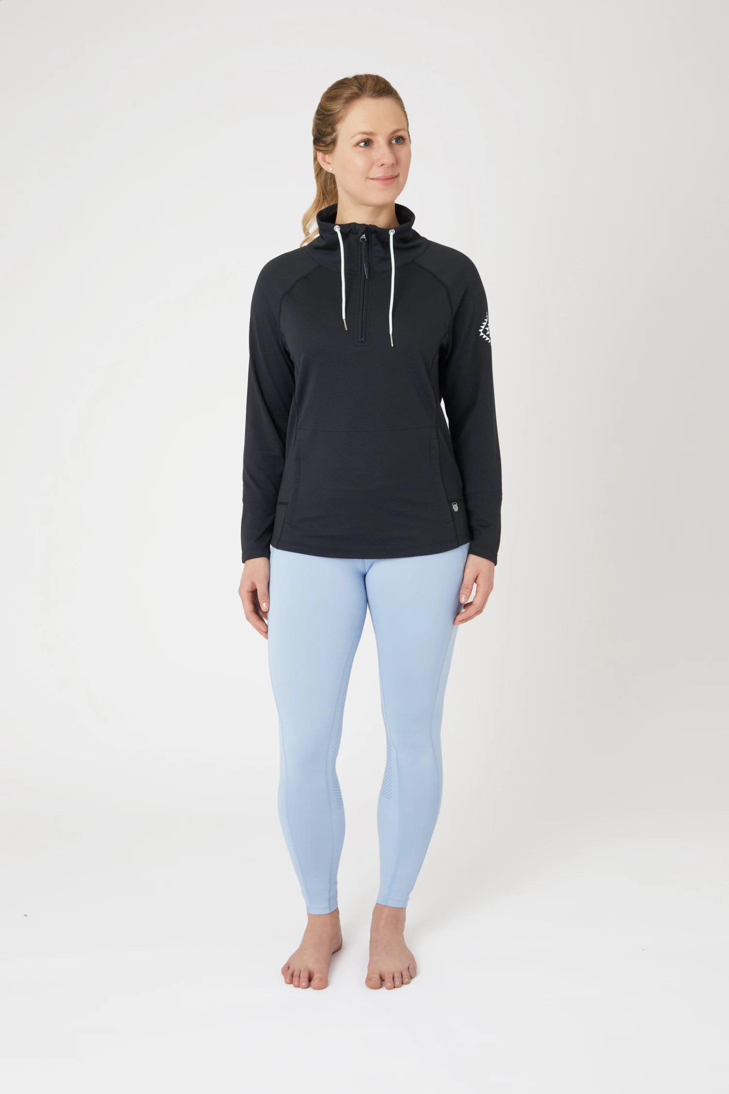 This functional half zip sweatshirt is perfect for spring days thanks to its breathable & lightweight fabric. The stand-up collar keeps off wind and is decorated with hood strings. The left sleeve is adorned with a small aztec print with Horze logo.