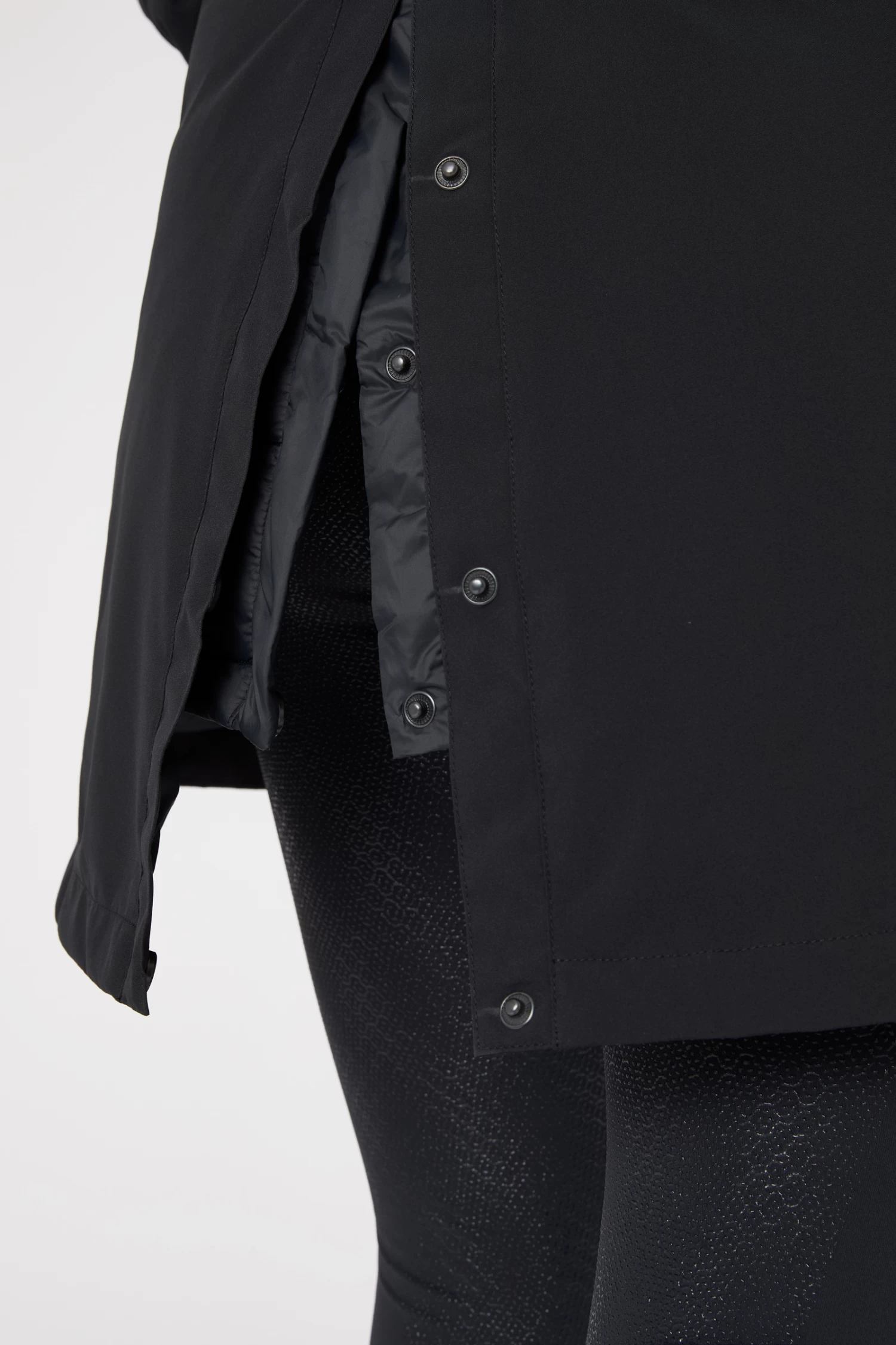 Our Horze Isabella parka jacket is designed as an inner and an outer jacket. Each can be worn separately on days where you need a rain jacket or a padded one. Together they create a warm, water repellent parka. The hood is detachable, and you can adjust the waist for your perfect fit. Two zipper pockets keep your belongings safe. The back slit with press buttons is comfortable and functional for riding.