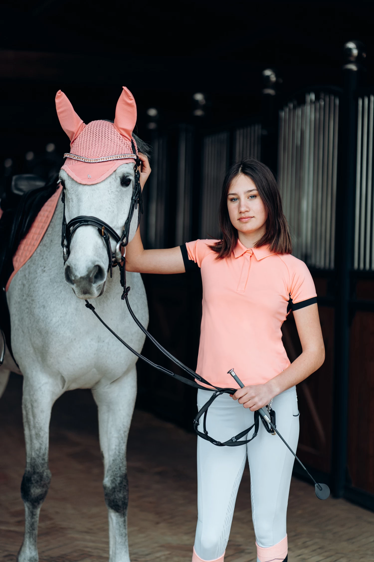 The Horze Laura shirt is perfect for active days: In your daily training, time in the stables and on summer rides. Mesh fabric on the armpits keeps you cool, and the firm fabric feels soft on your skin. Summery colours are easy to incorporate into your seasonal wardrobe. The classic cut is sporty and timeless. A metallic logo at the back adds an eye catching detail.