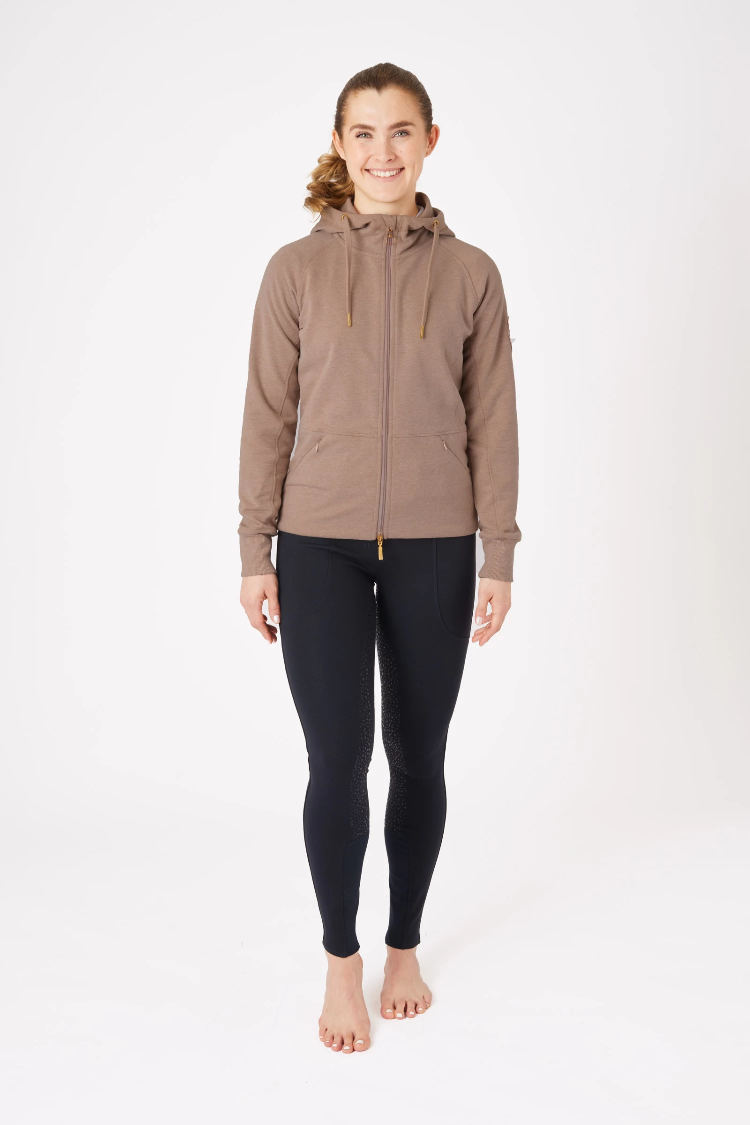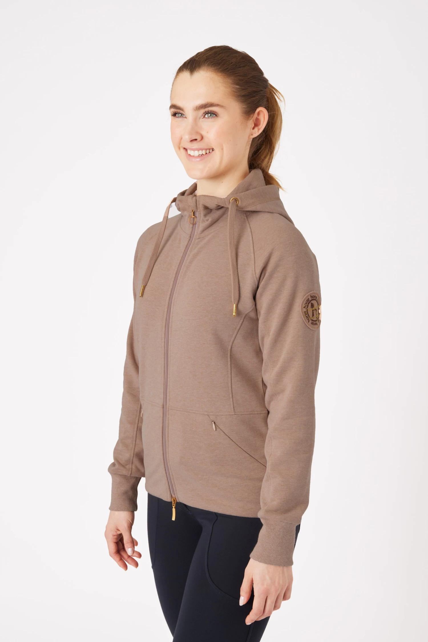 Made from a soft stretchable fabric with a brushed inside for extra warmth and comfort this is the perfect addition to you autumn wardrobe. The convenient 2-way zip makes the jacket extra suitable for riding, yet, thanks to the melange optic and slightly contrasting jersey fabric around the edge of the hood and its inside, this sweatjacket is also trendy outside the barn. Invisible zipper pockets securely store your essentials.