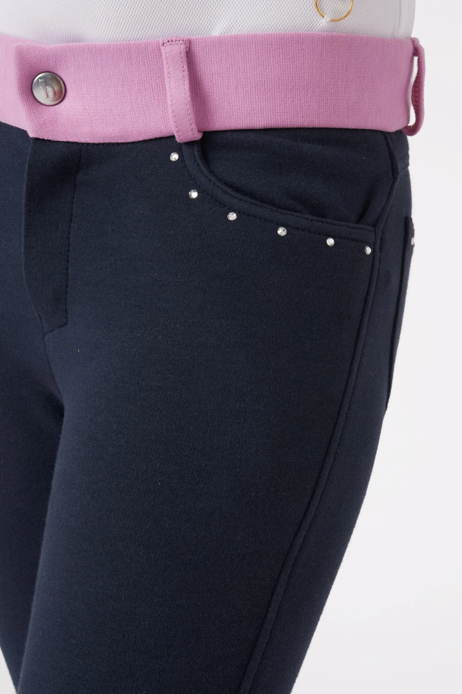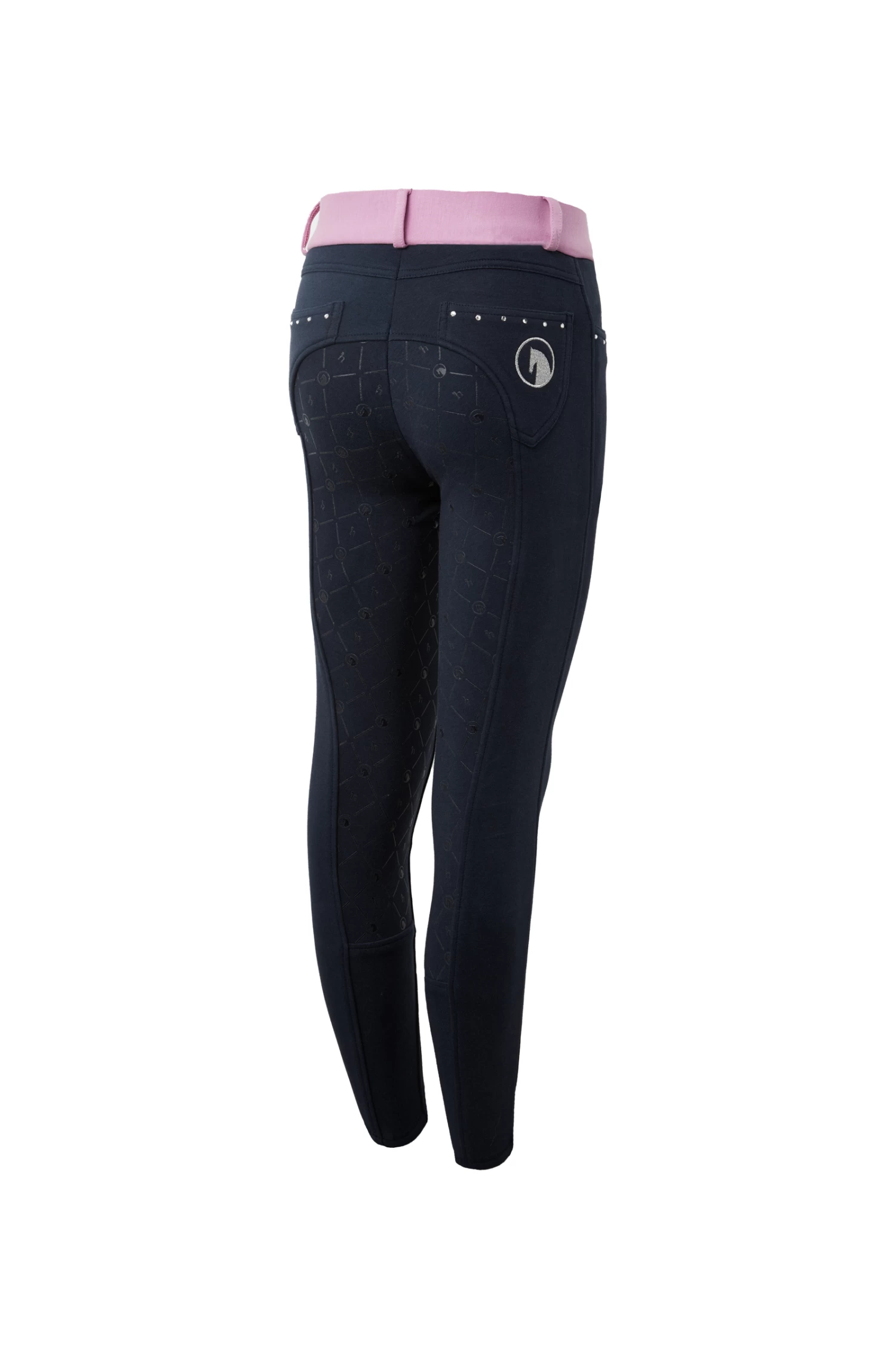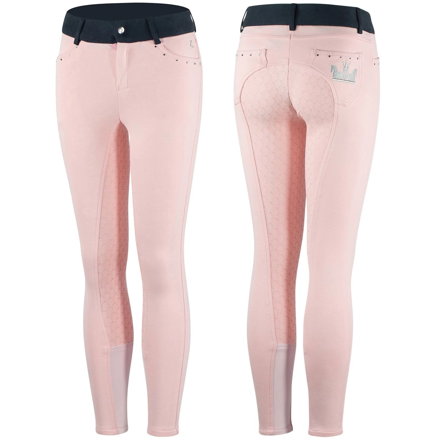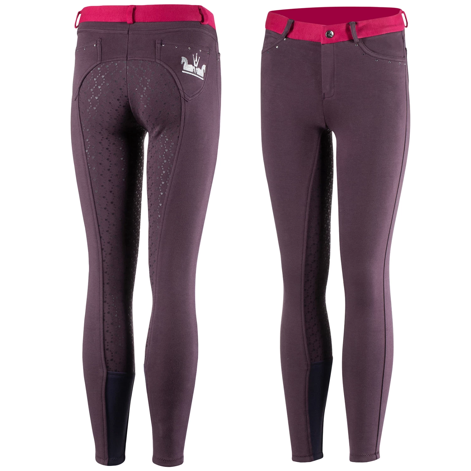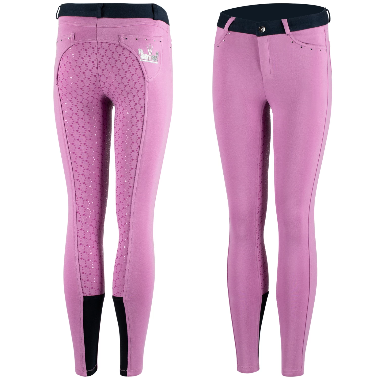 Crystal embellished pockets make these breeches a bit fancy, and the silicone print is a fun hearts-and-stars motif. The knitted cotton fabric is soft and stretchy, so pulling them on won’t be hard work, and the high waist ensures your young rider will ride in comfort.