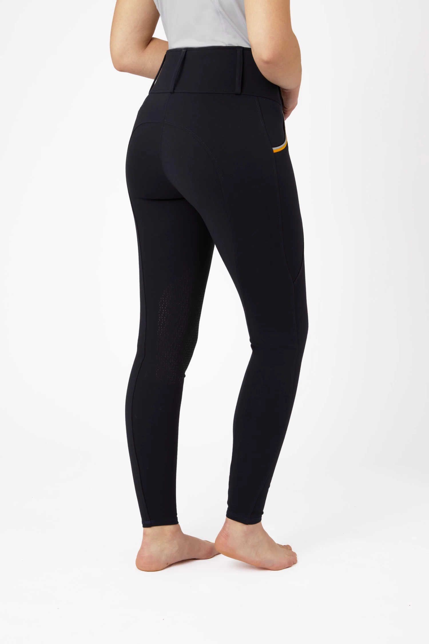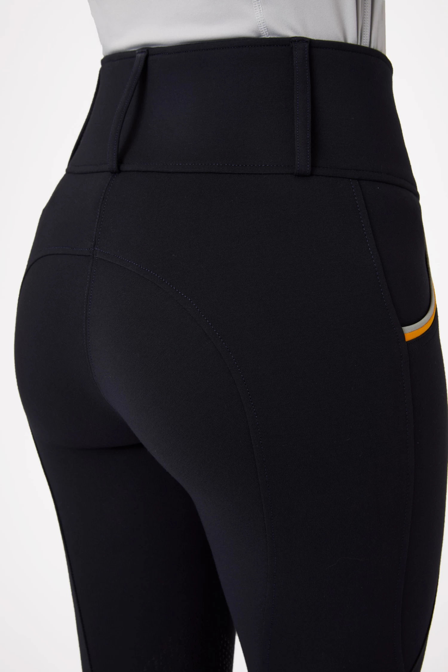 Plain ridign tights with eye-catching piping along the front pocktes.