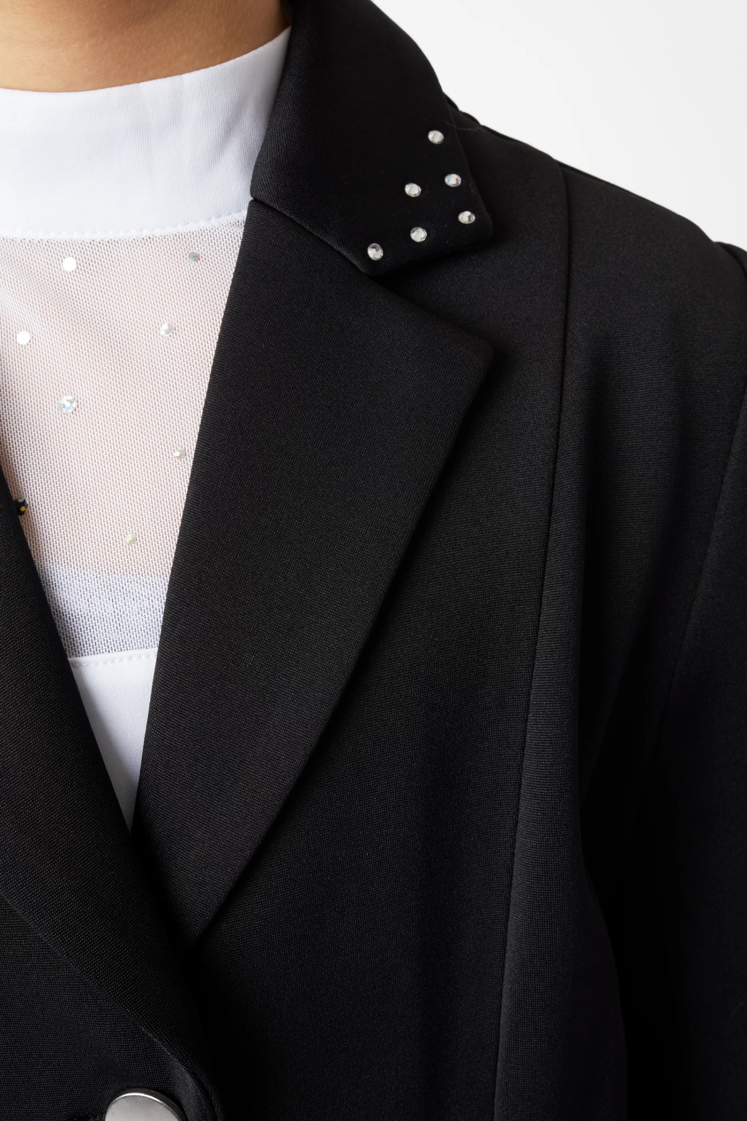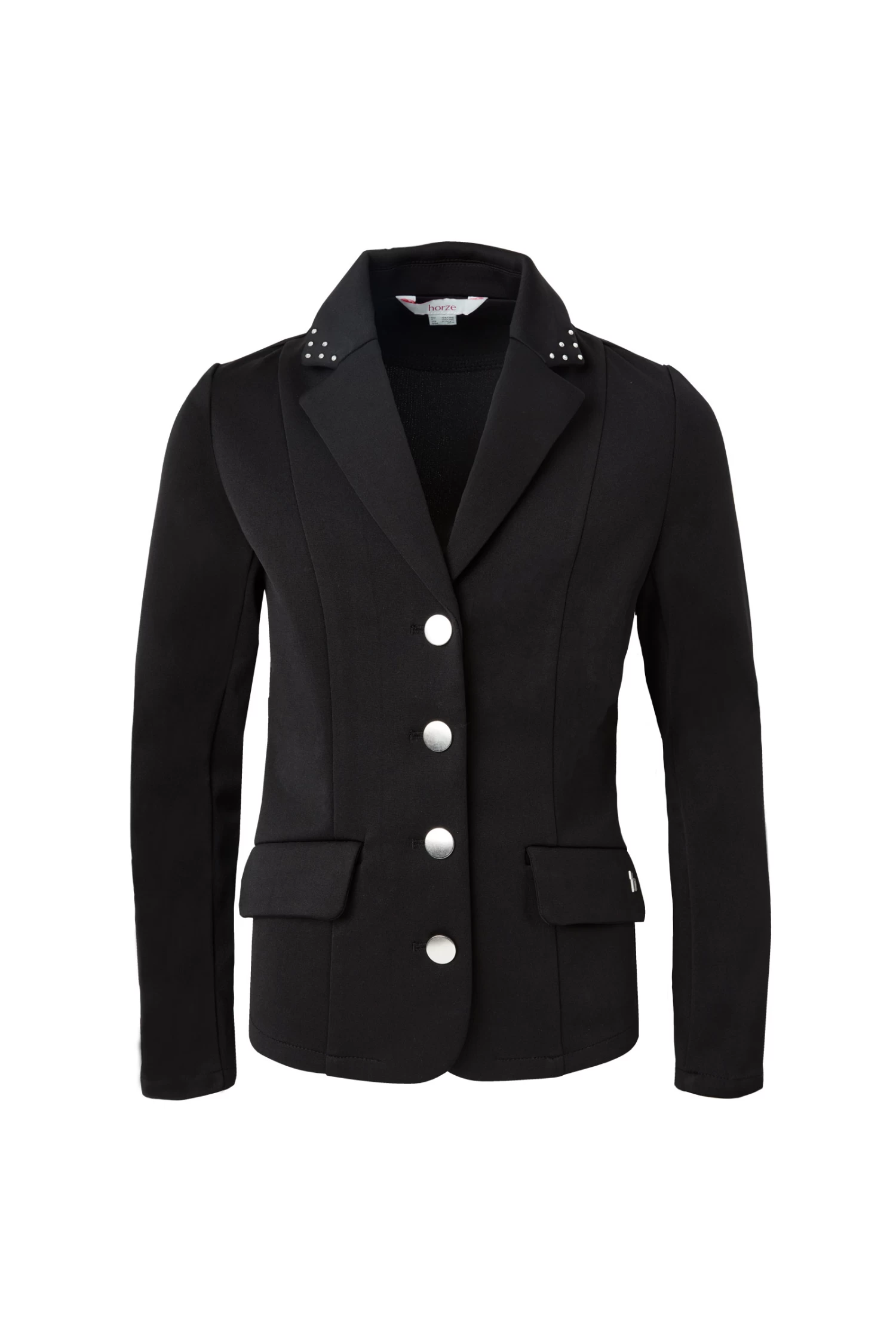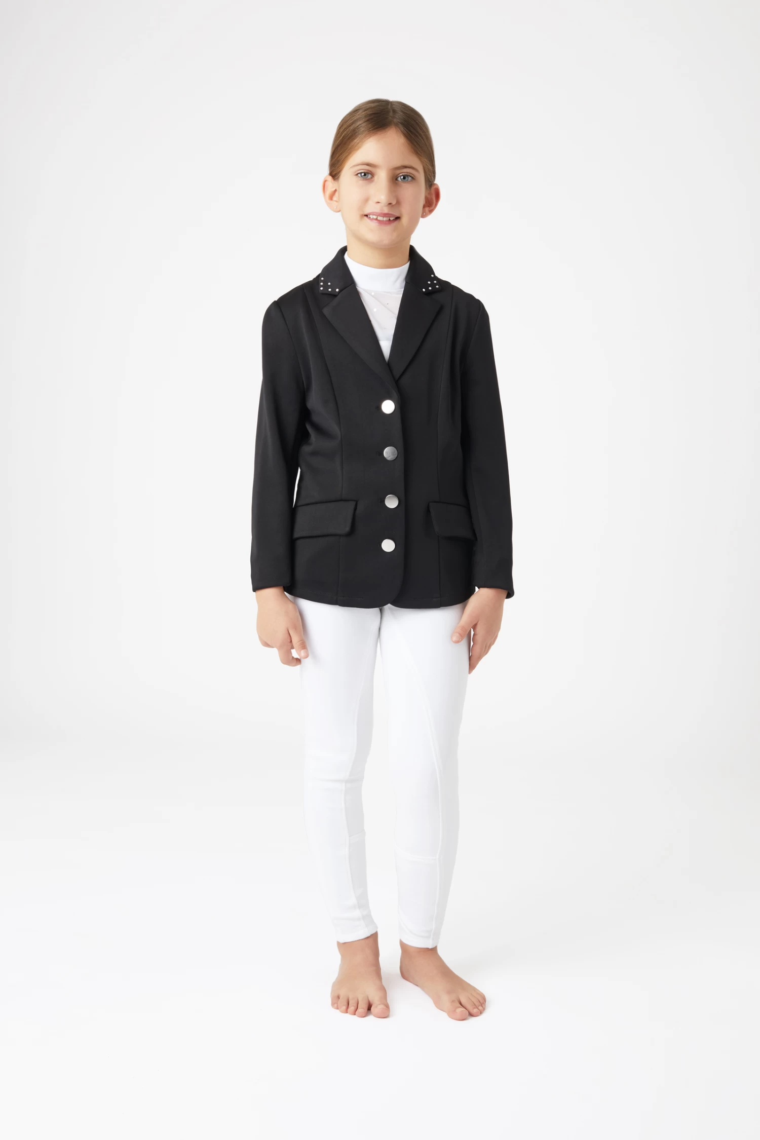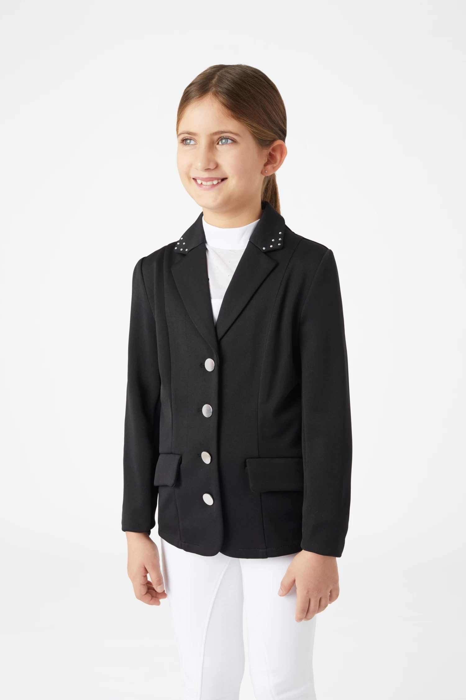 You child takes part in the first shows? Whether it be dressage or show jumping, this show jacket with its traditional cut and rhinestones on the collar will be the perfect choice for young girls who like a bit of sparkle. The jacket closes with button, has two flap pockets and slits at the back for increased freedom of movement while on horseback. Small ‘h’ metal charm on left pocket flap.