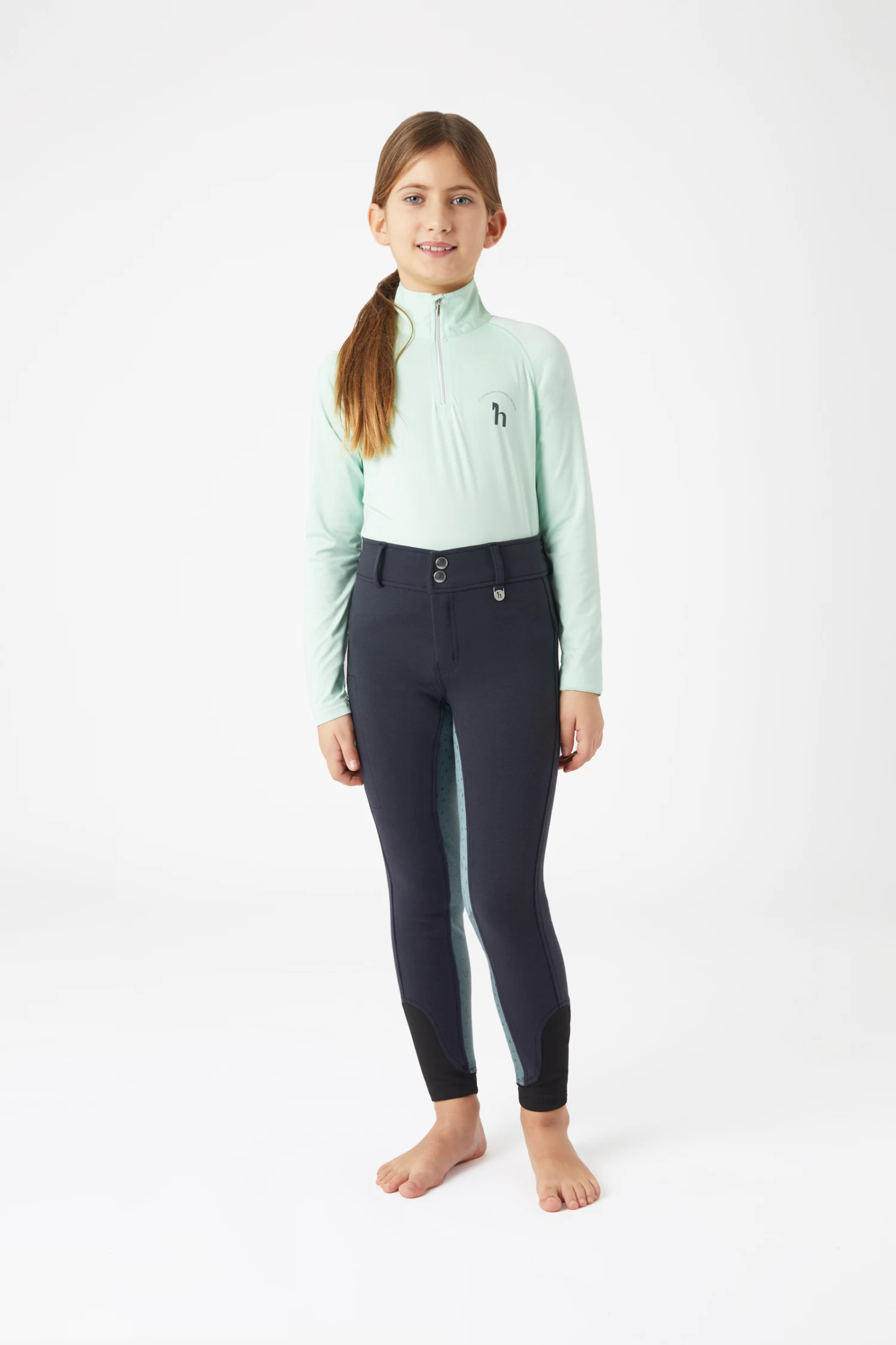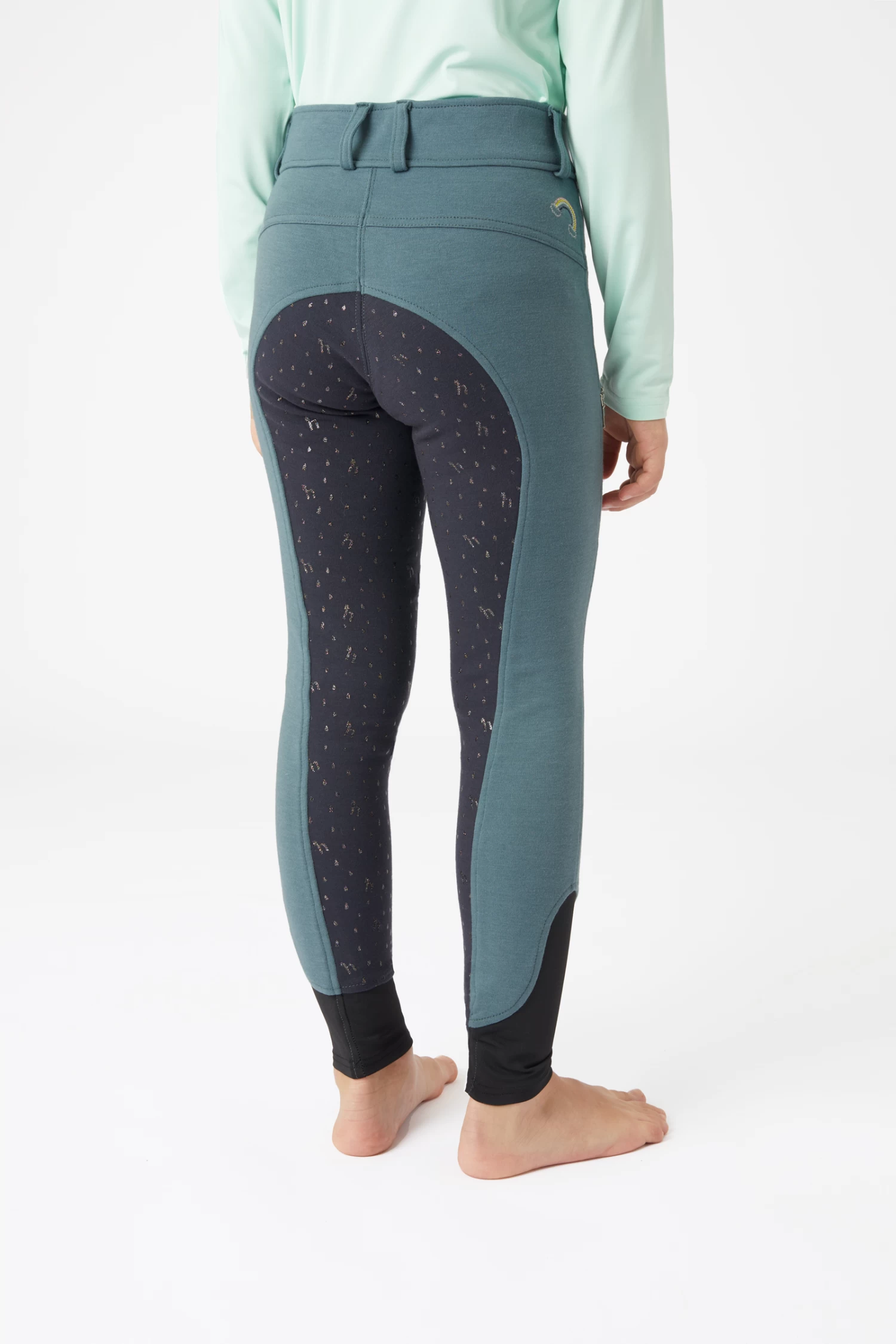 The perfect breeches for young girls who like to dress colourfully. The silicon full grip in pastel rainbow colours has the shape of raindrops and small ‘h’ logos. Below the back waistband a delicate rainbow embroidery is placed. Elastic leg cuffs for increased wearing comfort and less bulk beneath the boots. The breeches can be worn with a belt of your choice thanks to the belt loops. A zip pocket on the right thigh has enough room for your phone.