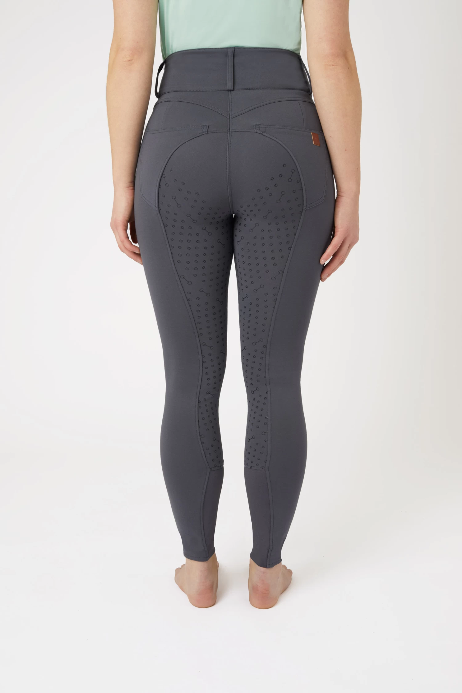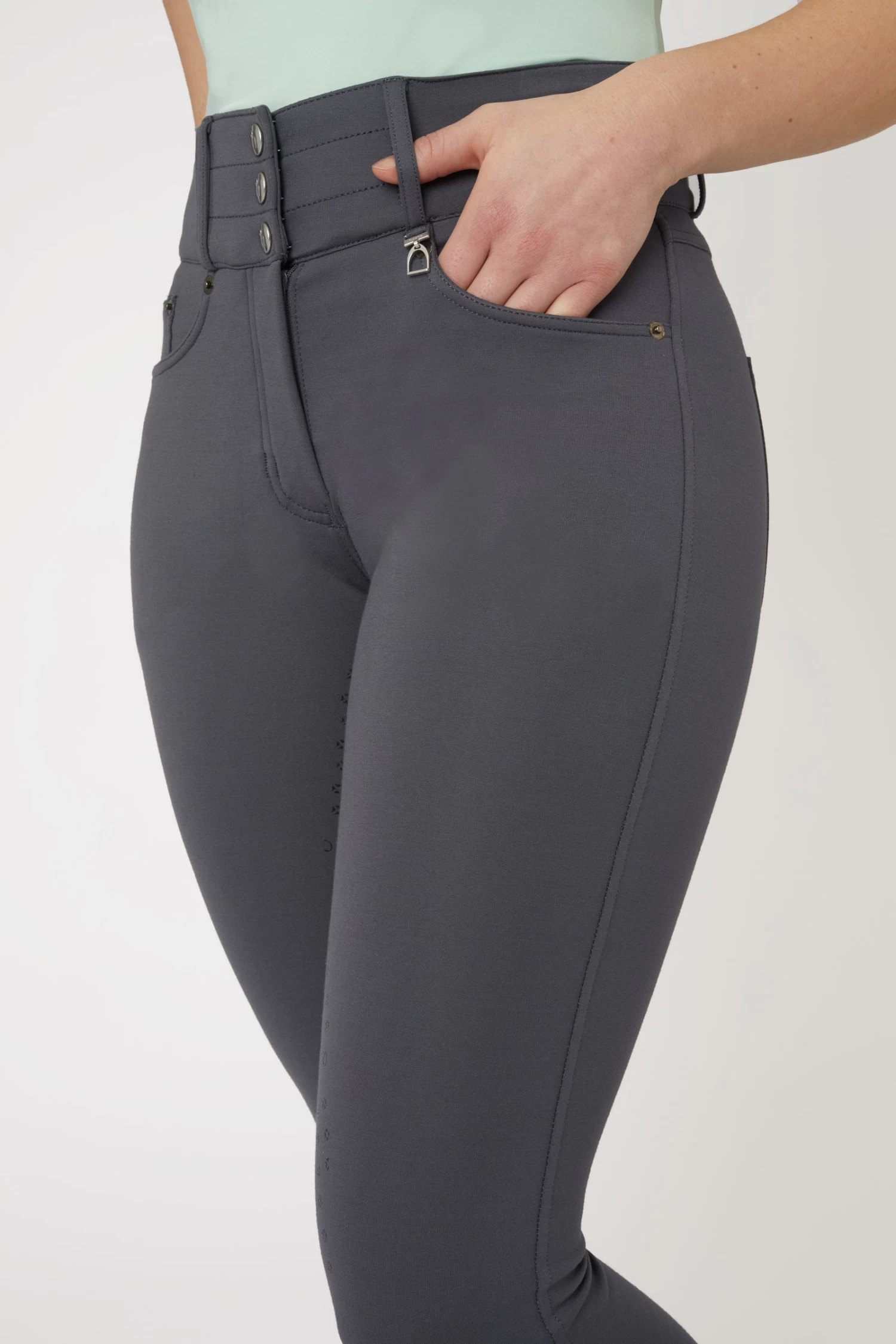Starting of with a slights higher cut at the back to provide optimal coverage even while in the saddle, while the back seams create a beautiful feminine silhouette. Furthermore, the left off silicon grip at the seat allows for more flexibility in the saddle, while the full grip still provides more grip compared to mere knee grip breeches. The wide waistband of these high waist breeches is super comfortable to wear and can still be combined with a belt of you choice thanks to the belt loops. The front closure with three gutos buttons are adorned with small ‘h’ logos. Several front and back pockets for stowing away small things or your phone. The stretchy breathable material makes these breeches a üerfect choice for every season.