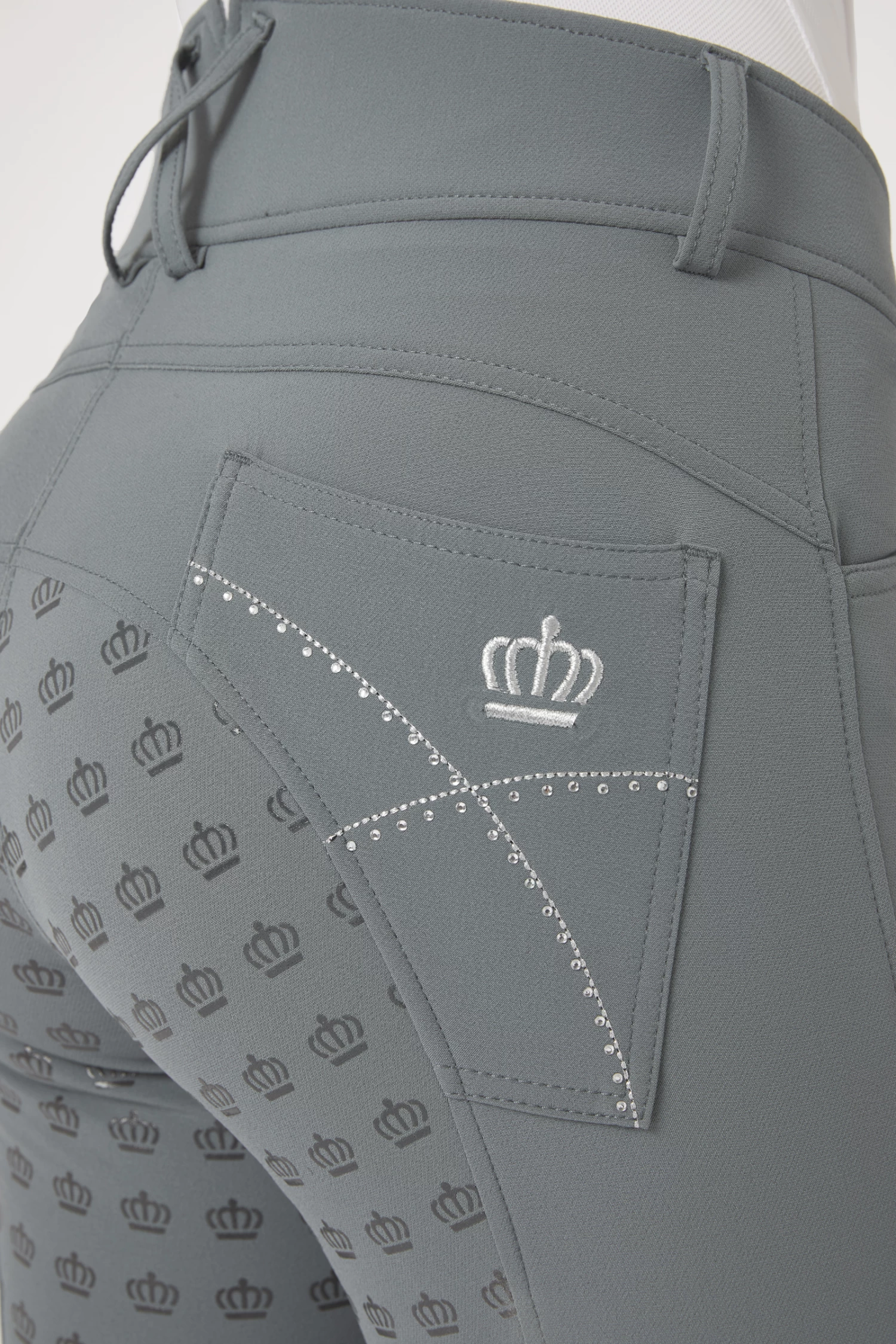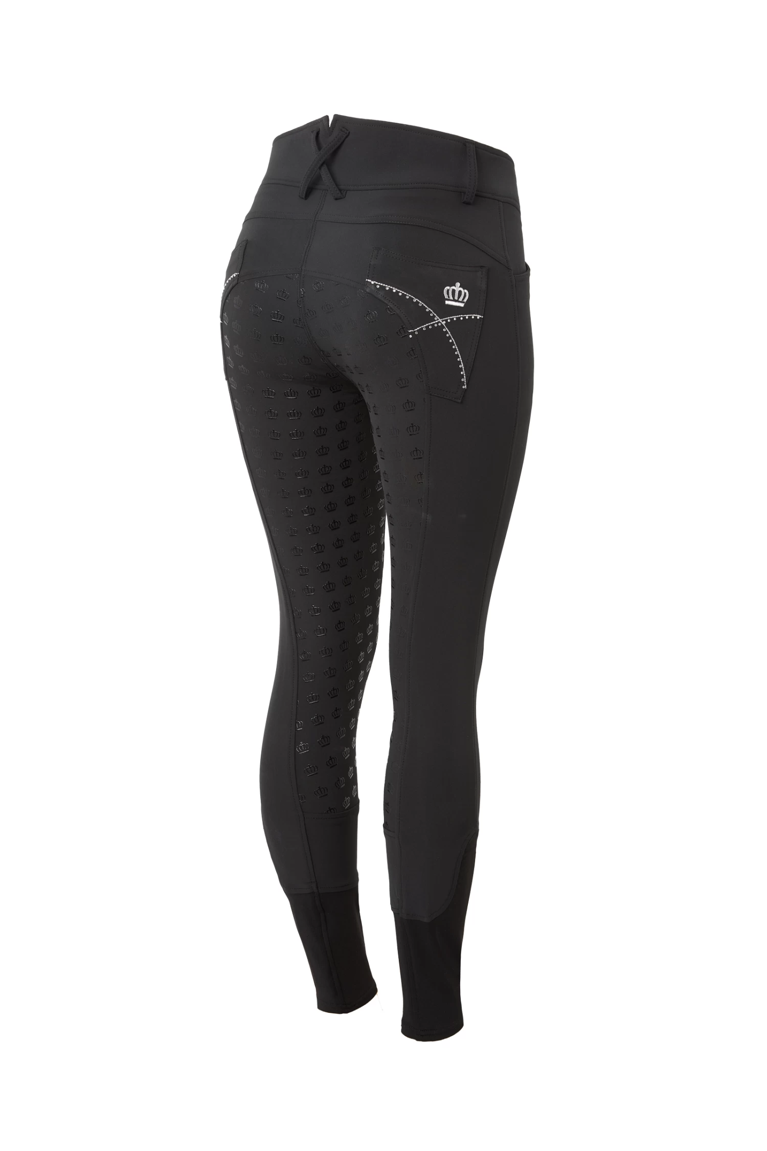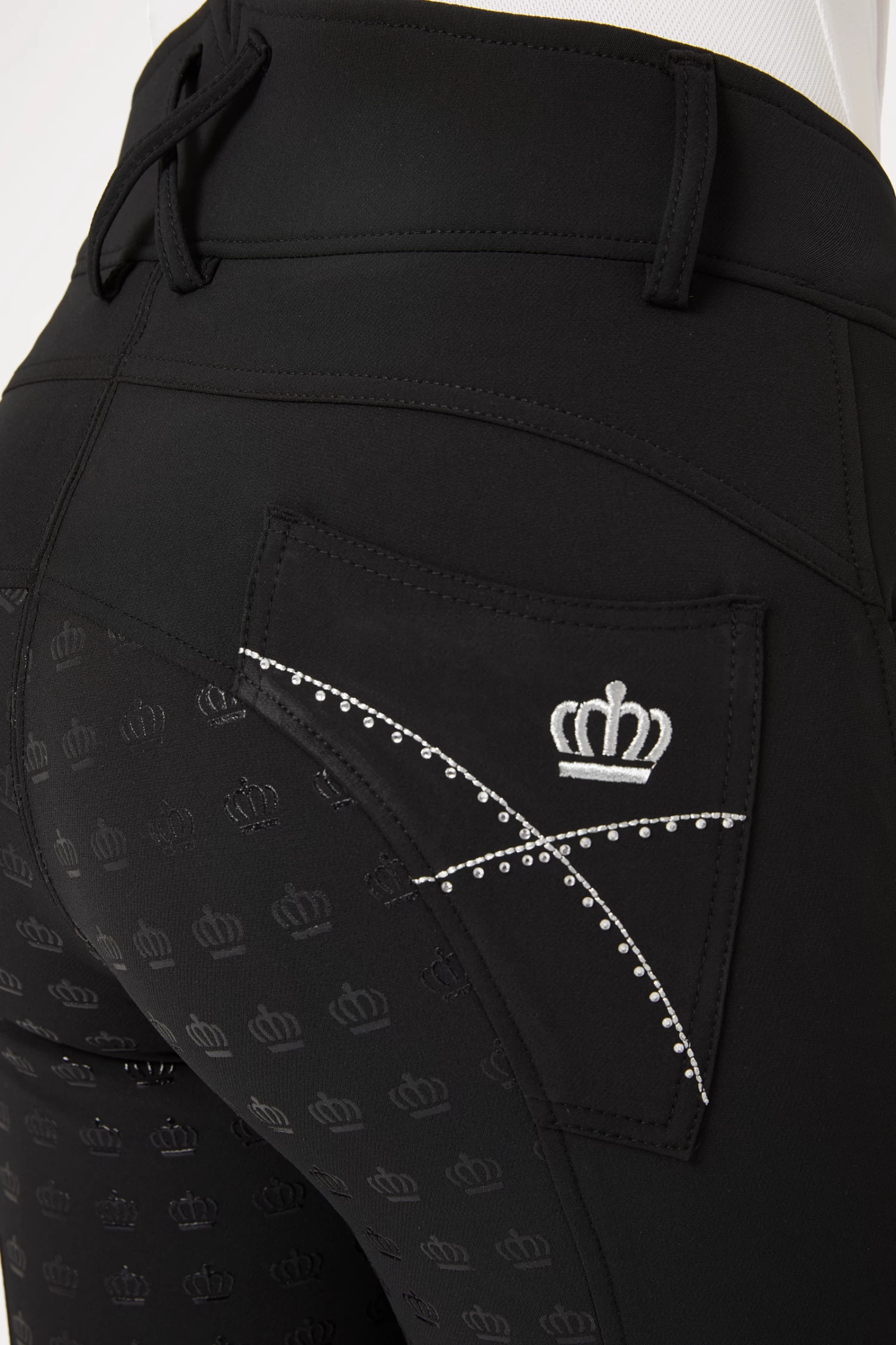 These gorgeous breeches take your outfit to the next level. A high waist keeps them in place, and the silicone full seat ensures good grip to the saddle. Elastic leg bottoms fit perfectly under your favourite boots. The back pockets are decorated with embroidery and crystals.