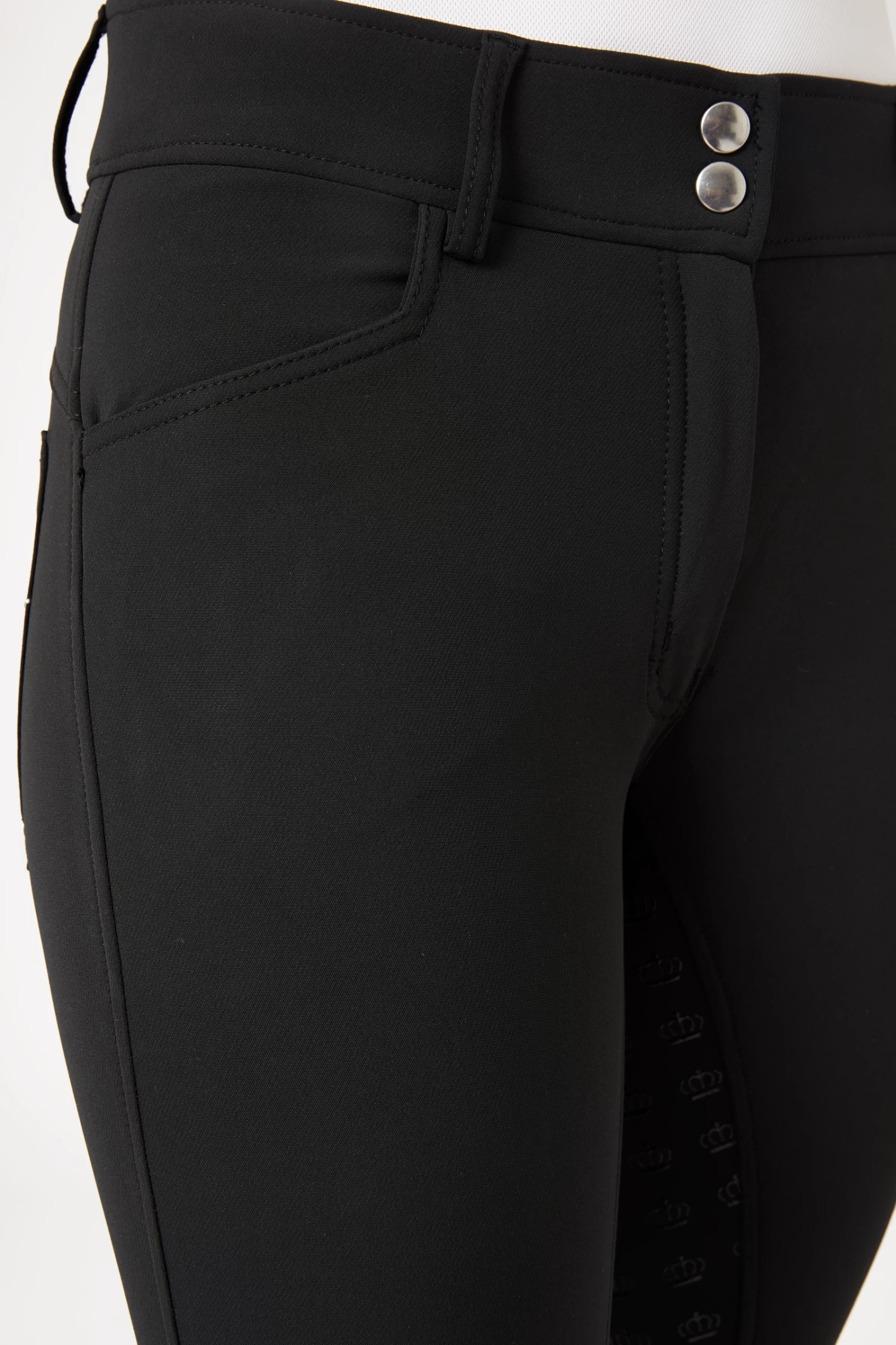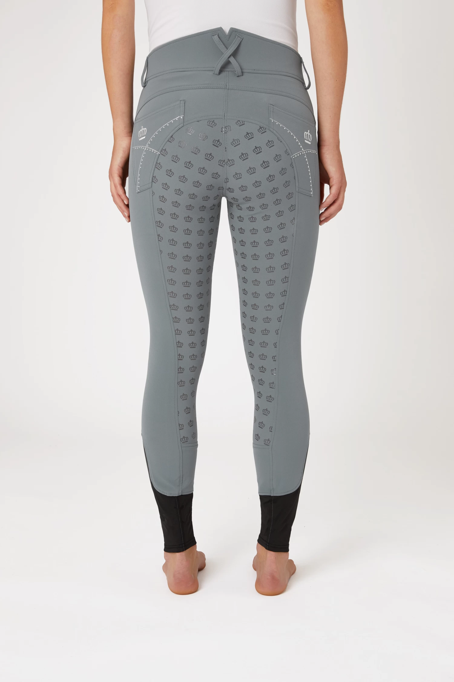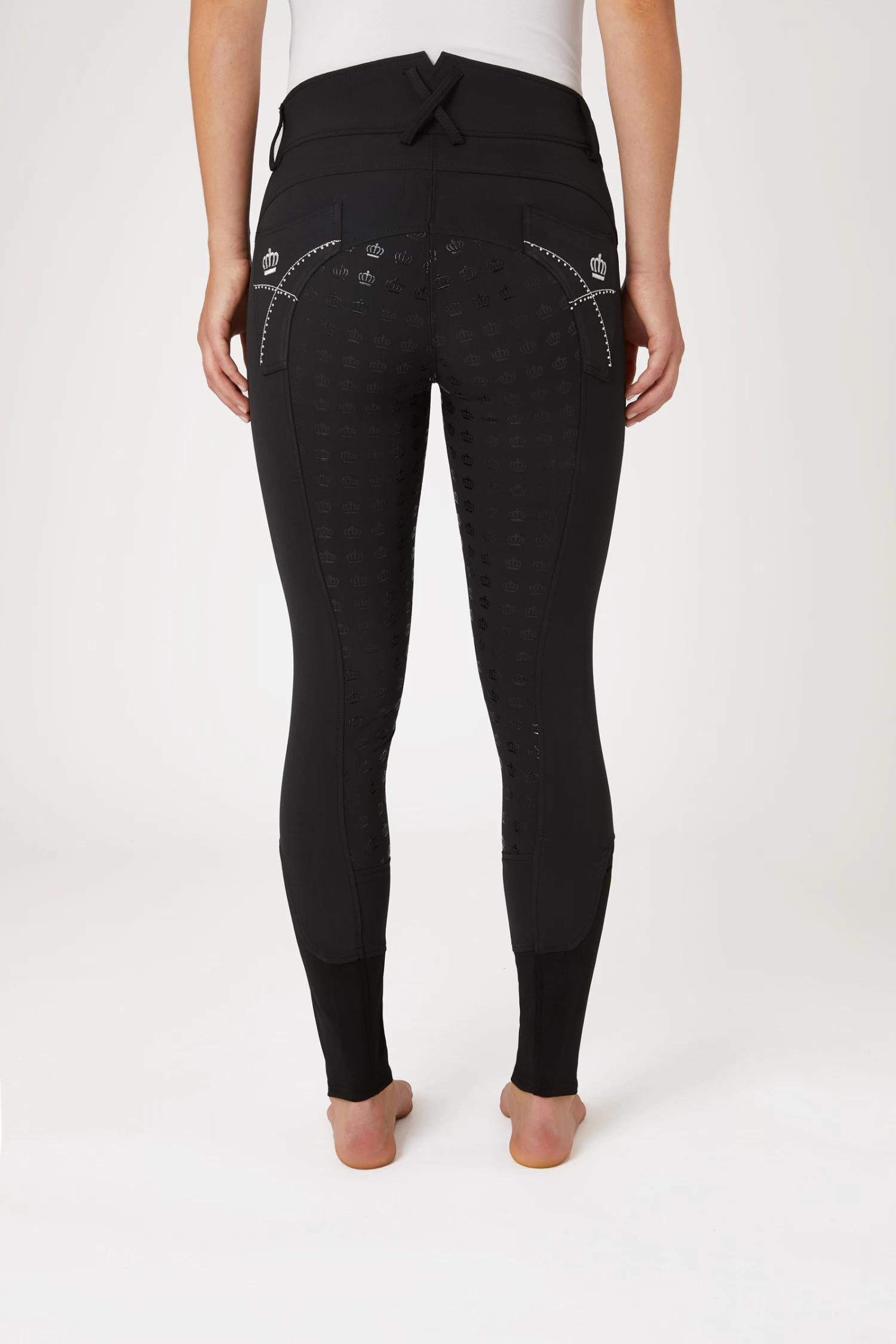 These gorgeous breeches take your outfit to the next level. A high waist keeps them in place, and the silicone full seat ensures good grip to the saddle. Elastic leg bottoms fit perfectly under your favourite boots. The back pockets are decorated with embroidery and crystals.