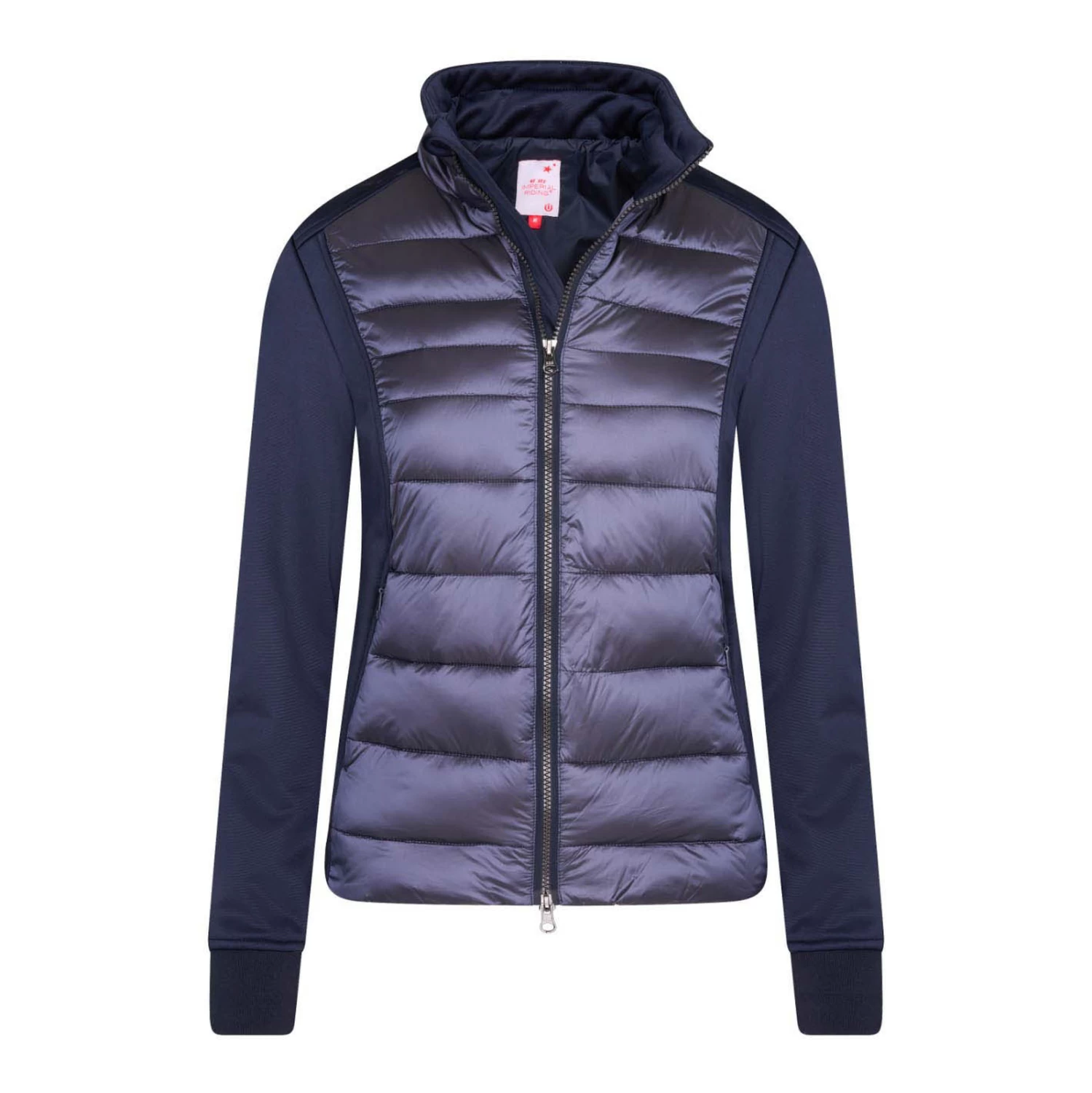 The all-seasons jacket with fake down front part with tube quilt pattern at the front side. The sleeves and backside are made in a tech shell fabric. Cuffs and hem in a 1×1 rib knit, 2-way zipper at the front and closable pockets with zippers. Notice the beautiful artwork on the back of the collar that has Imperial Riding written in rhinestones.
