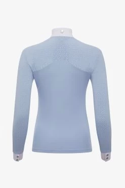 The Olivia Show Shirt provides the perfect blend of elegance and performance with super soft stretch fabric. An invisible front zip closure keeps the shirt sleek and the intricate diamante detailing adds just the right amount of sparkle. Delicate, laser-cut lace sleeve and back detail provides subtle beauty while also allowing air flow through the shirt to regulate heat and moisture. Finished with a white show collar with LeMieux stud detail.