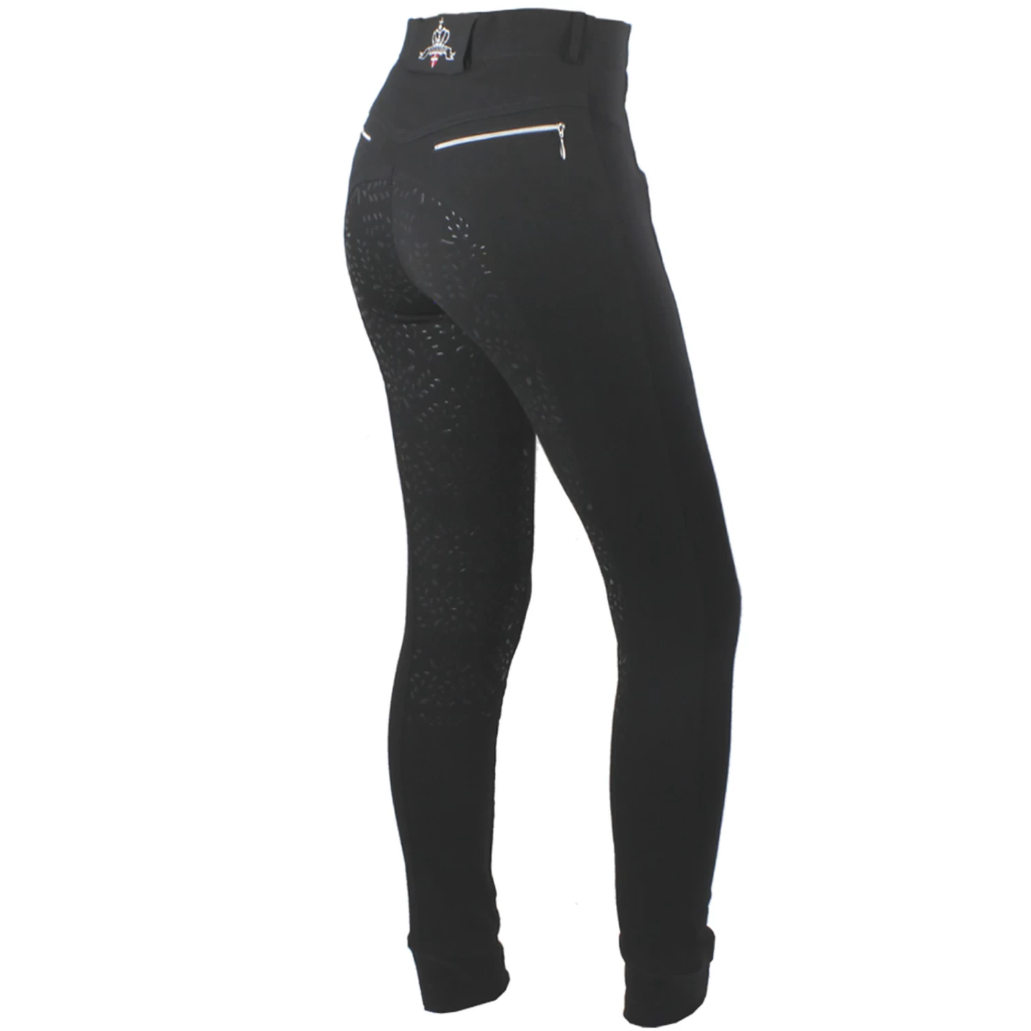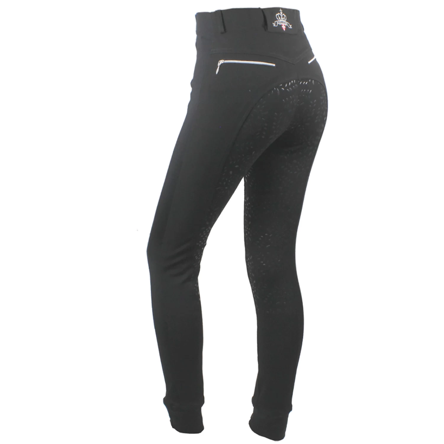 Smart and comfortable pull-up breeches “Equestrian leaves Pull-up” with Power-Grip in the shape of small leaves. Smart and wellfitted pull-up breeches in a strong, comfortable elastic, 4-way stretch material (viscose-polyester-spandex). A strong elastic insert down the side seams, gives the breeches the same features as a leggings – without button and zipper – but with all the wellknown benefits of a traditional breeches in terms of support and fit. They have form-cut waitsline and slightly higher rear waist, which gives the pants a snug and perfect fit. With silver zippers on both back pockets and a smart “tunnel” belt-strap center back, with embroidered logo in silver. Full grip in HD (High Density) in the form of small leaves that cover the entire seat and the inside of the legs. The legs are completed with a convenient and comfortabel elastic cuff so that the breeches will fit any leg size till. A smart and extremely practical breches for those who prioritize the comfortable.