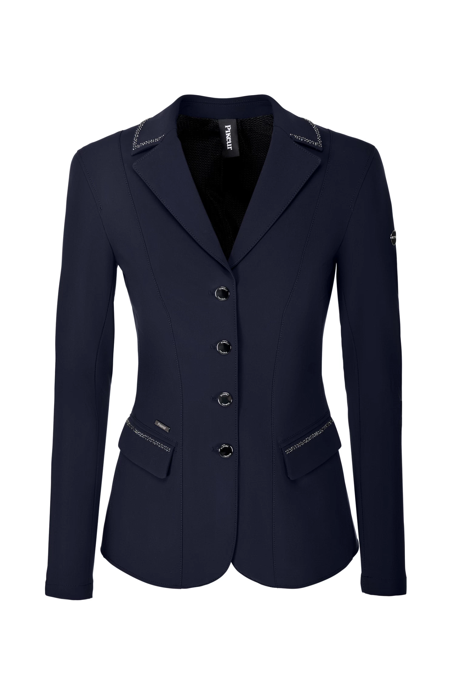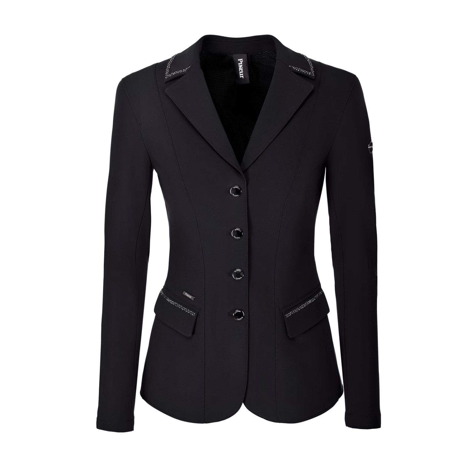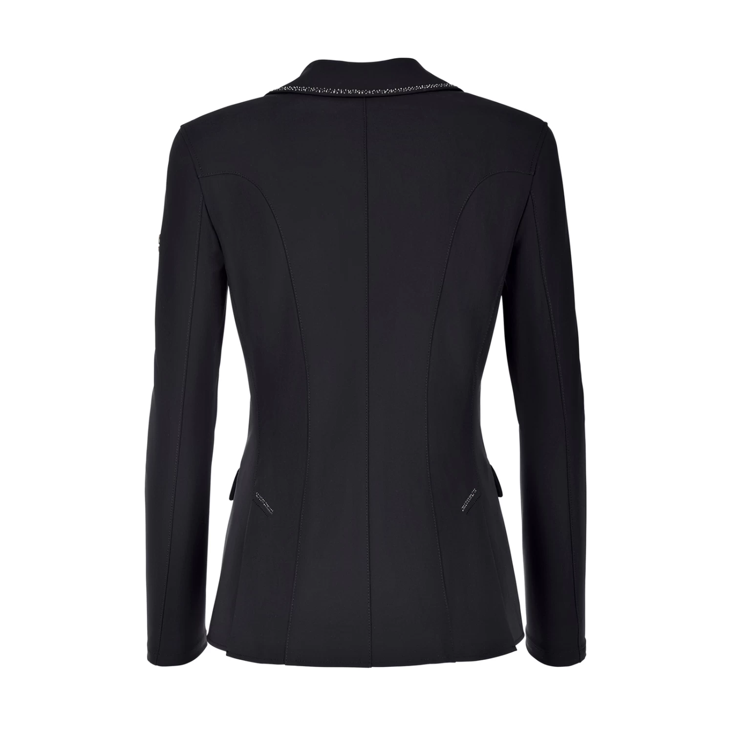 - Elegant ladies’ jacket with rhinestone appliqué on collar and flap pockets
