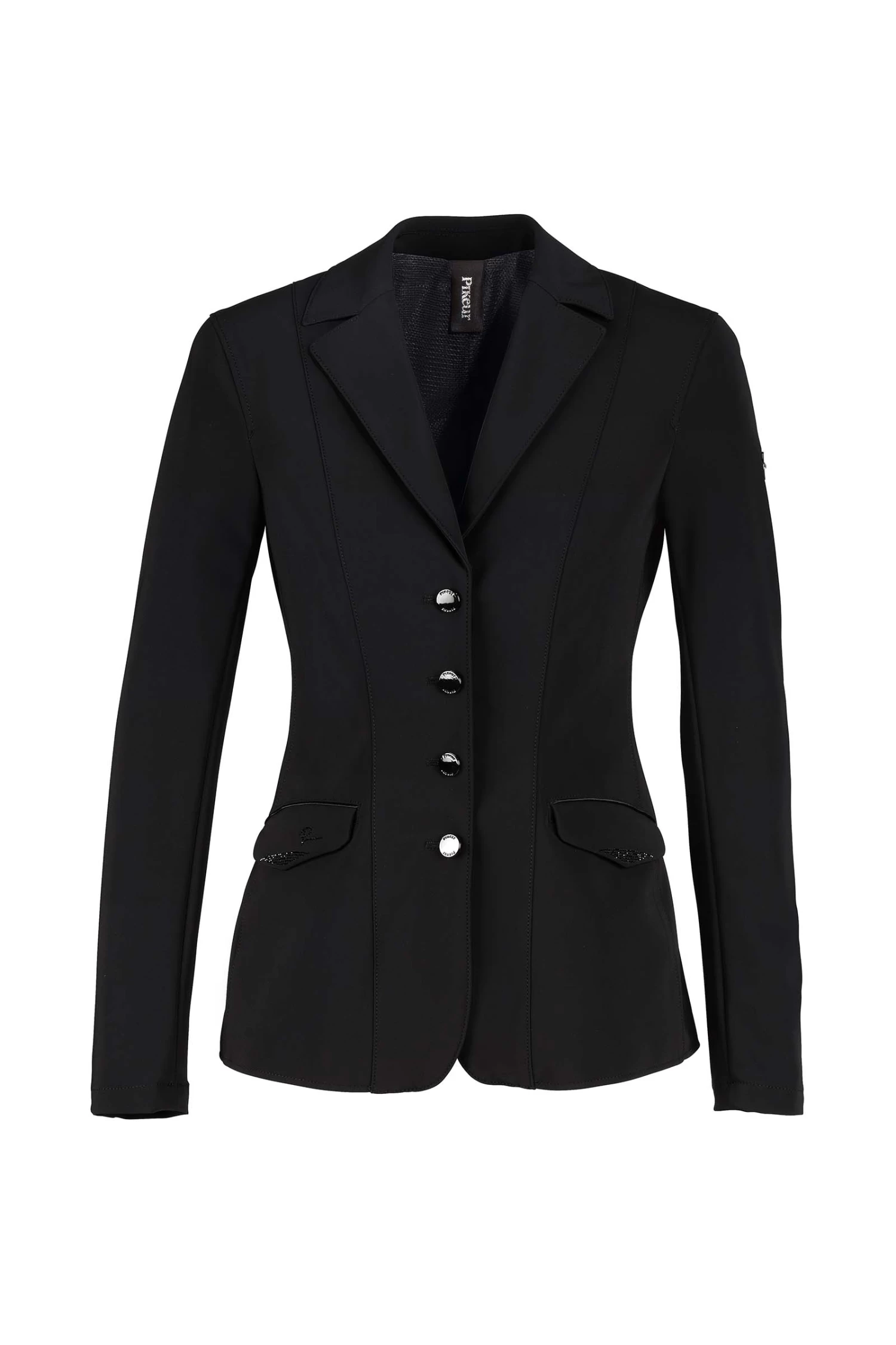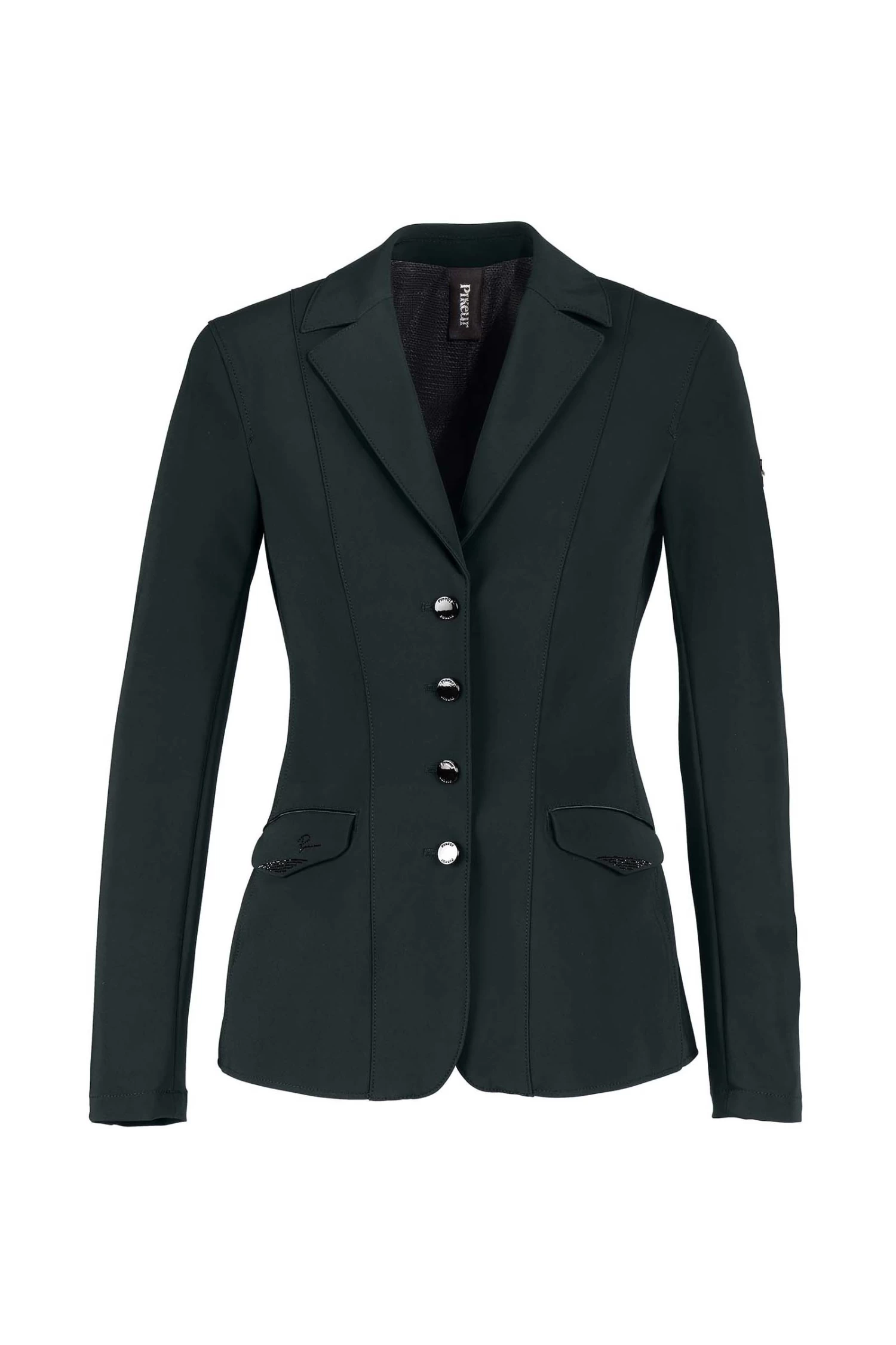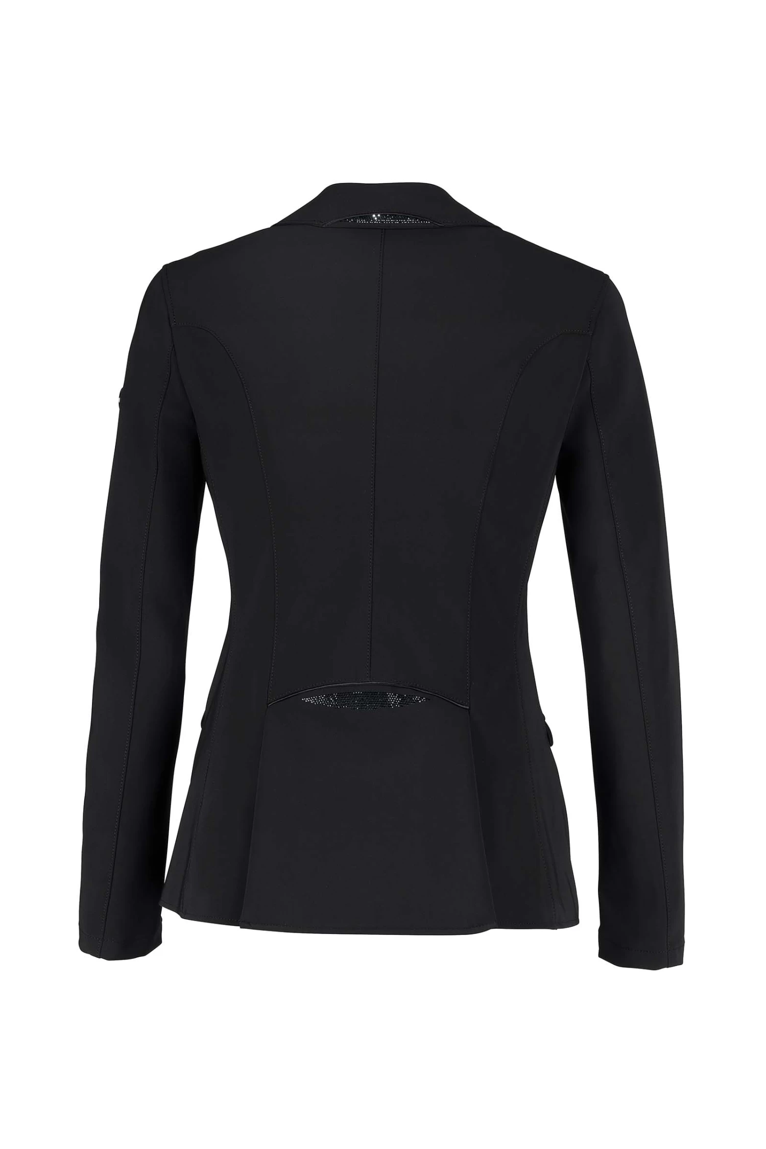 - Flap pockets with subtle, matching Rhinestone application and delicate satin piping, repeated on collar insert and in waist area of back section