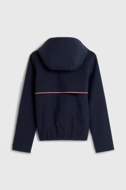 Performance rain jacket in a bomber style with an elastic waistband and air vent on the back. Features a detachable hood, waterproof two-tone 2-way zip on the front and side pockets, tonal adjustable Velcro fasteners on the cuffs, silicon label on the left chest and TH Global Stripe edging across the back. The jacket is WP10000mm, MP 10000g/m2/24h, all critical seams are welded and is made from a waterproof, breathable, 3-layer laminate elastic material that stretches in all 4 directions.